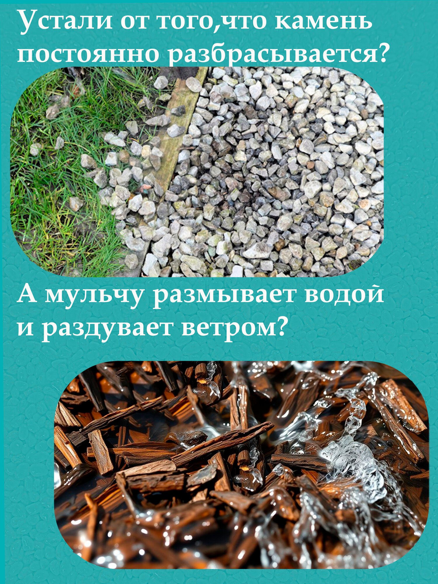 Надежно скрепляет (фиксирует) гальку, каменную крошку, мульчу, идеально подходит для декоративных клумб, заполнения гальки в промежутках между тротуарными или пошаговыми плитками. Больше нет проблем с уборкой листвы, разбросанными камнями по всему участку, смытой дождями древесной корой. Выдерживает умеренную пешую нагрузку – вы сможете спокойно поливать растения не переживая за сохранность камня на земле. Легко наносится на уже уложенный материал. Безопасно для растений и почвы.