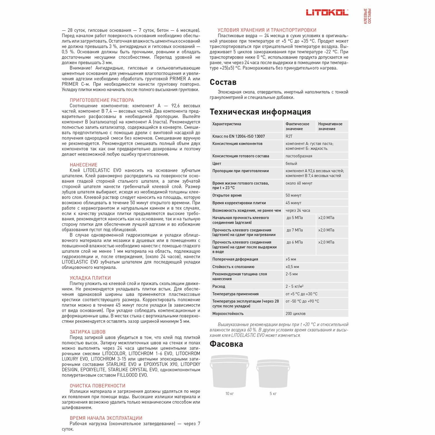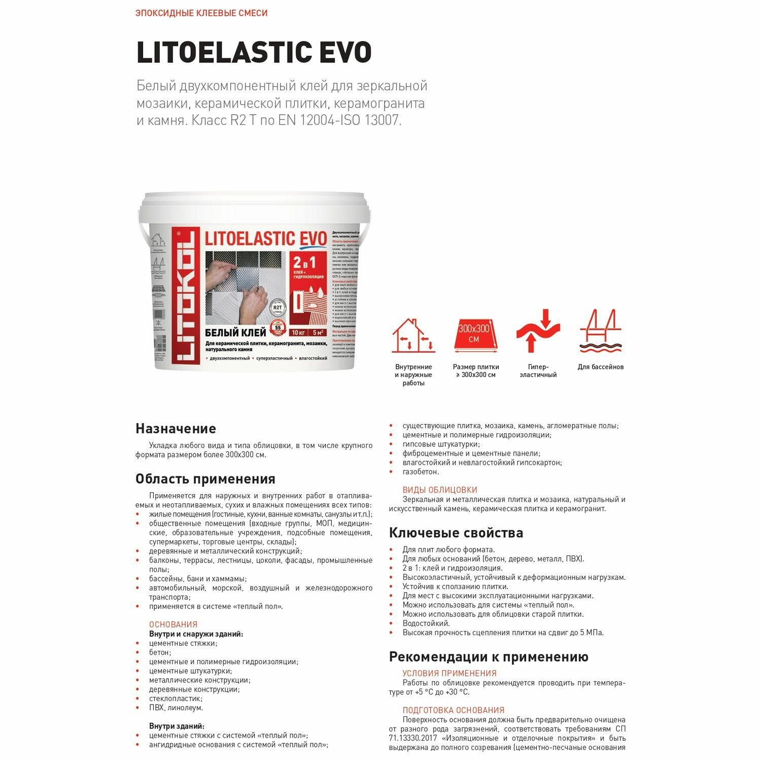 Клей для плитки Litokol Litoelastic Evo – эпоксидный двухкомпонентный клей на основе смол, который относится к классу R2 T (R2 - реактивный клей с увеличенной адгезией; T - тиксотропный или стойкий к оползанию плитки на вертикальных поверхностях). В комплекте поставки банка с синтетическими смолами и инертным заполнителем (компонент А), и упаковка катализатора (компонент Б), которые перед применением необходимо перемешать друг с другом и получить состав, который необходимо применить в течение 50 минут. Данный клей обладает особыми характеристиками - во первых, он имеет адгезию ко всем основаниям - к традиционным бетонным и цементным, к дереву, пластику, металлу, стеклу и пр. Во-вторых, он позволяет уложить любую плитку любого формата - вплоть до уязвимого зеленого мрамора или тонкого крупноформатного керамогранита. Отлично эксплуатируется в тяжелых условиях эксплуатации: в бассейнах, хаммамах, ванных, на полах с интенсивным движением, а также на поверхностях, подвергающимся значительным температурным шокам.