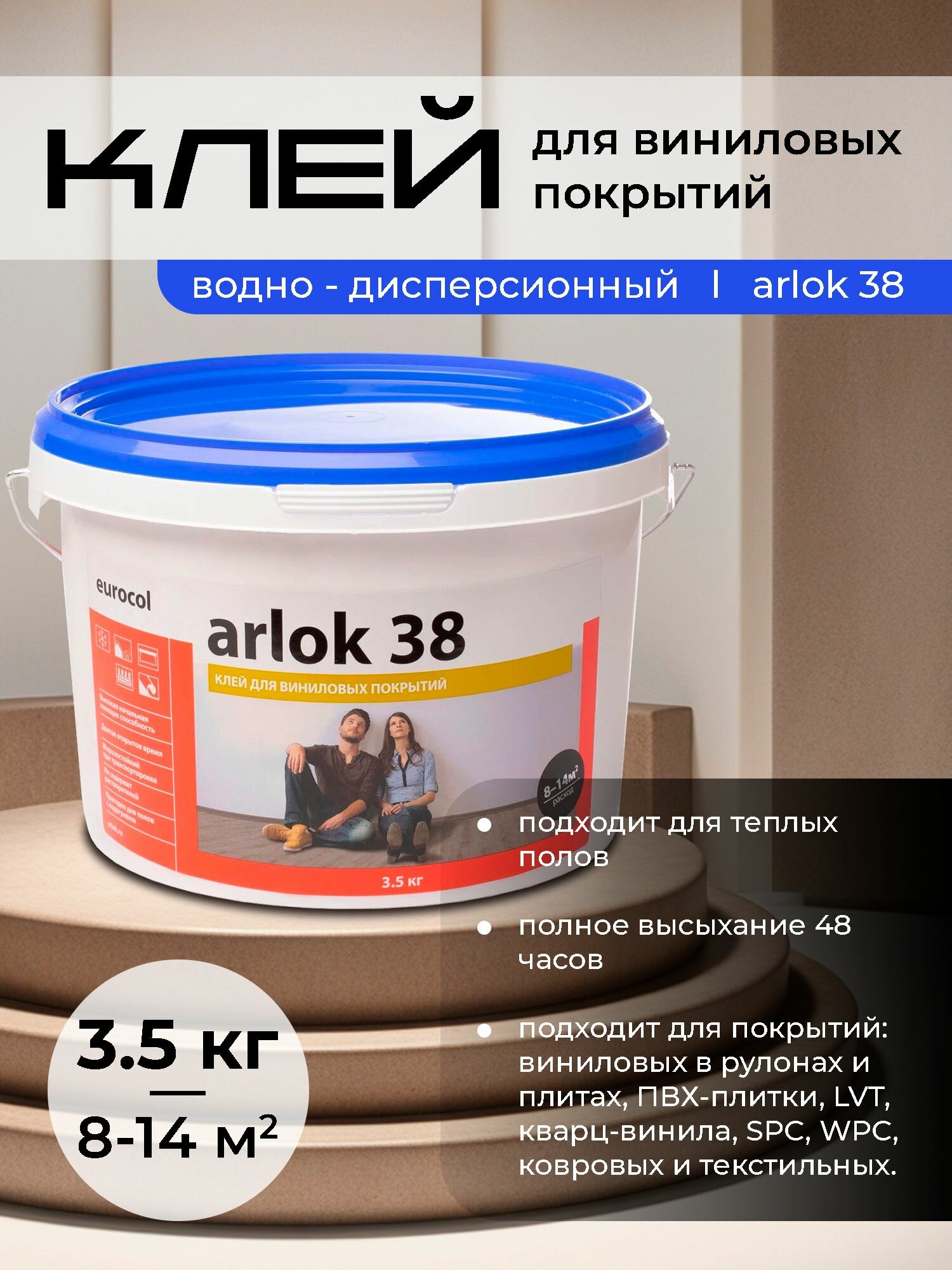 Клей для ПВХ плитки Eurocol Arlok 38, 3,5кг /Клеевой состав для виниловых покрытий, LVT, ПВХ-плитки, рулонных и текстильных покрытий: сравнение цен, характеристики, фото, актуальное наличие и цены.