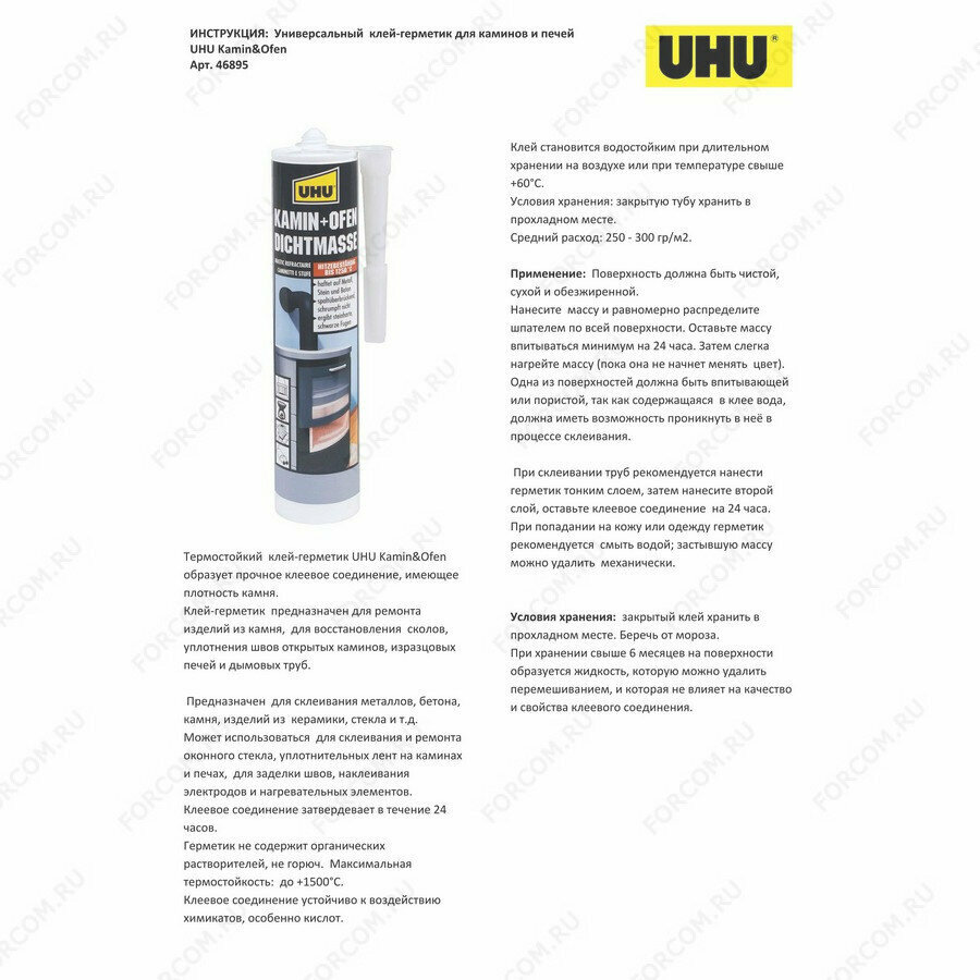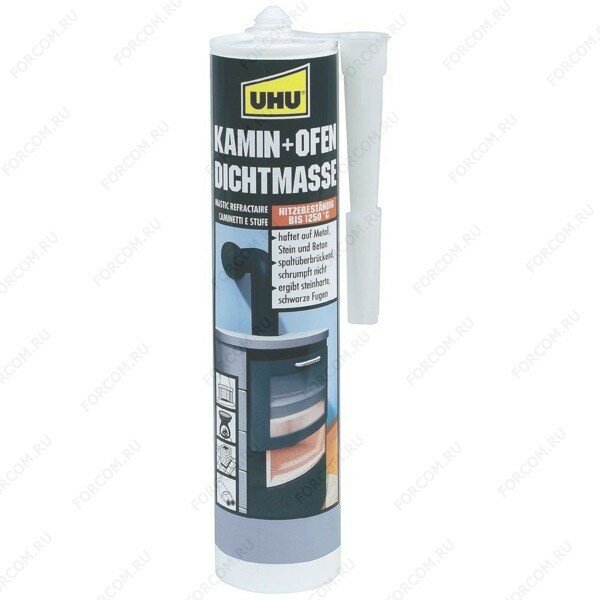 Герметик для каминов и печей UHU Kamin & Ofen не содержит органических растворителей, благодаря чему не воспламеняется. Устойчив ко многим химикатам, особенно к кислотам, становится водостойким при длительном хранении на воздухе или при температуре выше +60 °С.