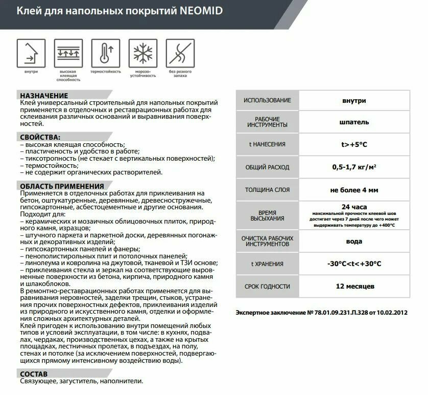 Высокая клеящая способность, пластичен и удобен в работе, тиксотропен (не стекает с вертикальных поверхностей), термостойкий, не содержит органических растворителей.