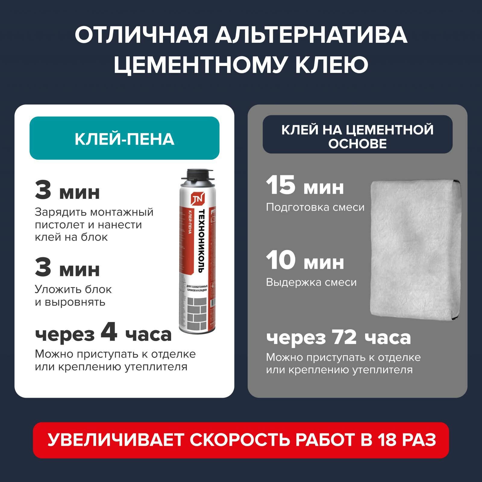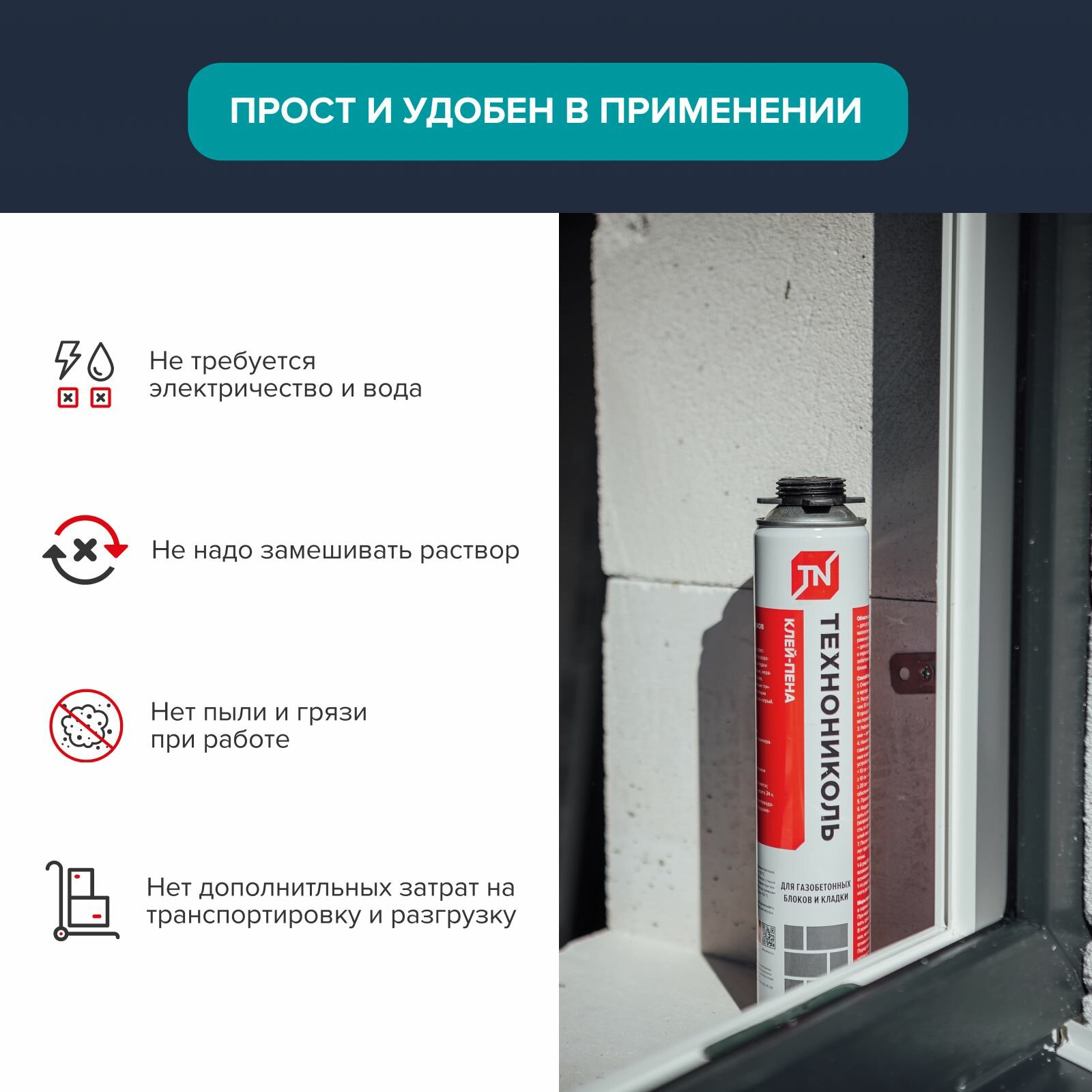 Клей-пена Технониколь - однокомпонентный профессиональный полиуретановый клей в аэрозольной упаковке для выполнения кладочных работ при возведении стен и перегородок из газобетонных, керамических и других блоков.