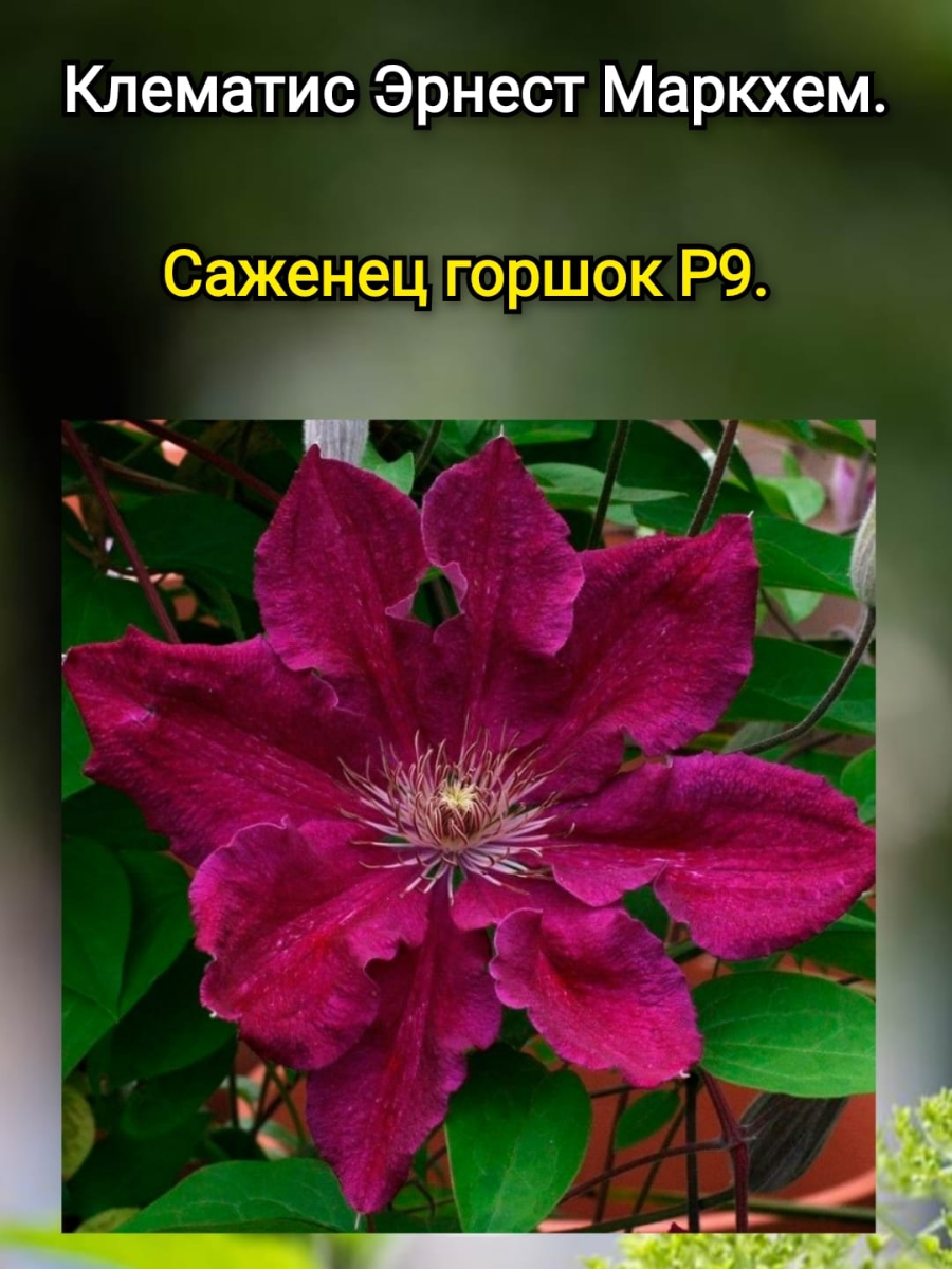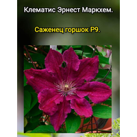 Клематис Эрнест Маркхэм растёт небольшим кустом с вьющимися стеблями. В высоту он может достигать от 2 до 3 м. Растение имеет крупные, ярко-малиновые цветки диаметром около 15 см. Они формируются многочисленными бархатными лепестками вытянутой формы. Цветение клематиса начинается под конец мая и длится до начала осени.