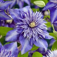 Клематис Мульти Блю – элегантный сорт с махровыми сине-фиолетовыми цветками. Центр более светлый, по центру лепестка проходит молочная полоса. Диаметр цветка – около 15 см. Очаровательный многолетник для оформления вертикальных композиций. Высота – до 250 см. Срок цветения – с августа по октябрь. Сорт относится ко второму типу обрезки, осенью укорачивают верхнюю часть побегов, оставляя от 50 до 100 см над уровнем почвы.