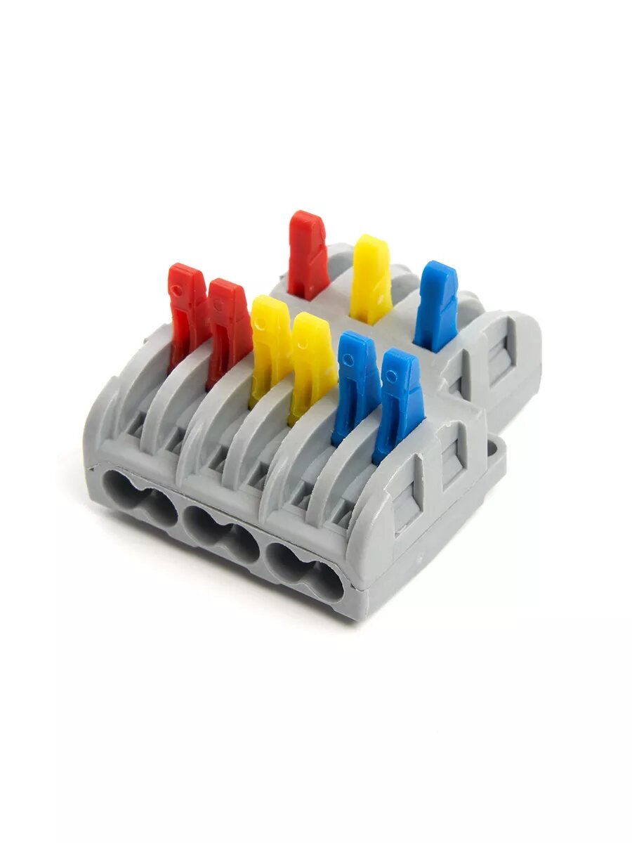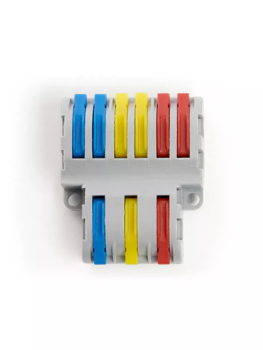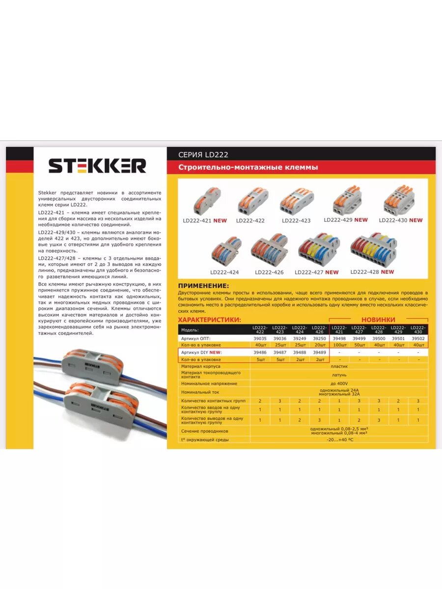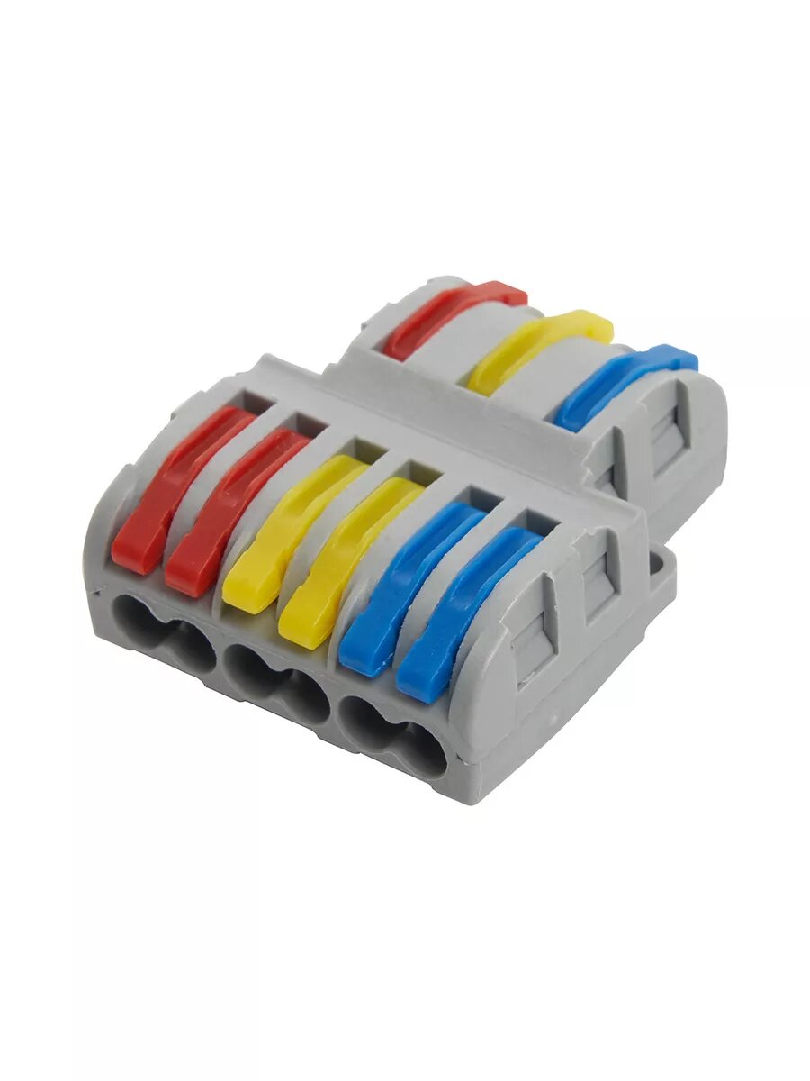 Забудьте о проблемах с подключением проводов - у нас есть идеальное решение! Набор универсальных соединительных клемм. Электромонтажный клеммник аналог ваго. Используются для быстрого подключения любых типов одножильных и многожильных, тонкопроволочных медных проводов до 2,5 мм2, защищая их от повреждения и исключая возможность замыкания без термоусадки обеспечивая изоляцию проводников. Соединитель для проводов по типу wago полностью закрывает кабель и не позволяет ему обнажиться. Очень удобен обжимной клемник при быстром наращивании и удлинении кабелей, подключении различных приборов в том числе светильников, а так же для использования в различных электроустановочных изделиях, таких как распределительные коробки и щитки. Клема контактная используется в целях переменного и постоянного тока до 450В. Зажим изготовлен из высококачественного пластика, контакты из латуни. Не теряйте времени на монтаж - выберите нашу обжимную клемму ваги и наслаждайтесь стабильной работой вашей электрической системы! Клемник строительно-монтажный для подключения фазных проводников 3 контактной группы имеет специальные крепления для сборки массива из нескольких изделий на необходимое количество соединений. STEKKER 39499
