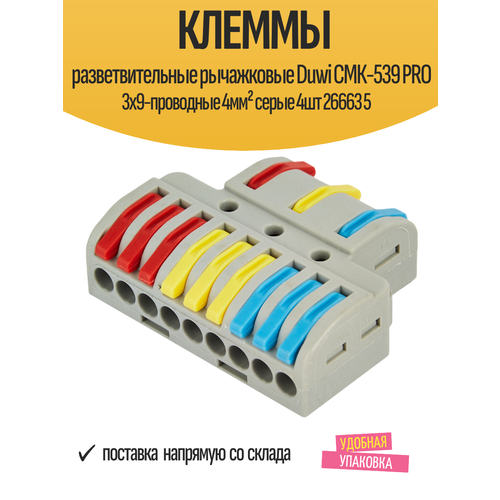 Клеммы разветвительные рычажковые 3х9-х проводные Duwi аналог WAGO/ваго. В наборе 4 шт. Предназначены для подключения осветительных приборов только с медными проводниками. Оснащены 3 зажимами с одной стороны и 6 — с другой. Выполнены из прочного пластика, отличающегося устойчивостью к механическим повреждениям, влиянию влаги, поражению плесенью, перепадам температур. Используется в цепях переменного и постоянного тока до 400 В. Преимущества- Быстрое и простое подключение.- Монтаж без инструментов.- Негорючий материал. - Многократное использование.- Улучшенная токовая проводимость зажимов.- Подходит для жесткого и гибкого кабеля, а также многожильных кабелей. - Специальные пазы в корпусе исключают возможность случайного отсоединения проводников. Характеристики- Рабочая температура -25 +85С.- Номинальный ток: 32 А.- Сечение жесткого проводника до 4 мм2.- Материал корпуса: термостойкий пластик.