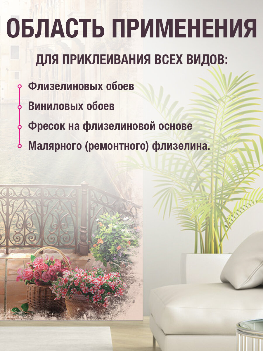 Готовый к применению обойный клей для приклеивания всех видов флизелиновых обоев, виниловых обоев, фресок на флизелиновой основе и малярного (ремонтного) флизелина.