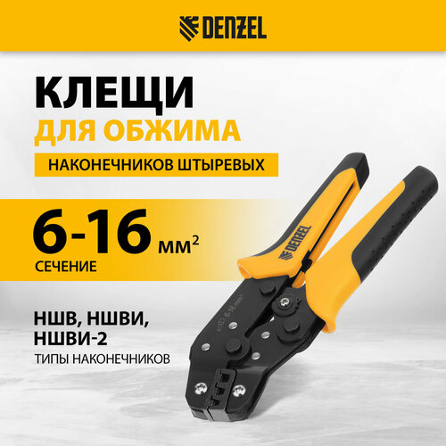 Клещи Denzel 17744 предназначены для обжима наконечников штыревых втулочных НШВ, НШВИ, НШВИ-2 сечением 6-16 мм². Двухрычажная передача усилия сжатия позволяет увеличить эффективность работы без дополнительный усилий мастера. Инструмент пригодится частным и профессиональным мастерам при проведении электромонтажных работ.