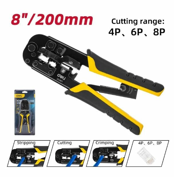 Купить Клещи обжимные (кримпер) DELI DL4971 с храповым механизмом 4P, 6P, 8P (200мм, для витой пары UTP/STP и телефонных кабелей) с доставкой по всей России. Клещи обжимные (кримпер) DELI DL4971 с храповым механизмом 4P, 6P, 8P (200мм, для витой пары UTP/STP и телефонных кабелей): сравнение цен, характеристики, фото, актуальное наличие и цены.