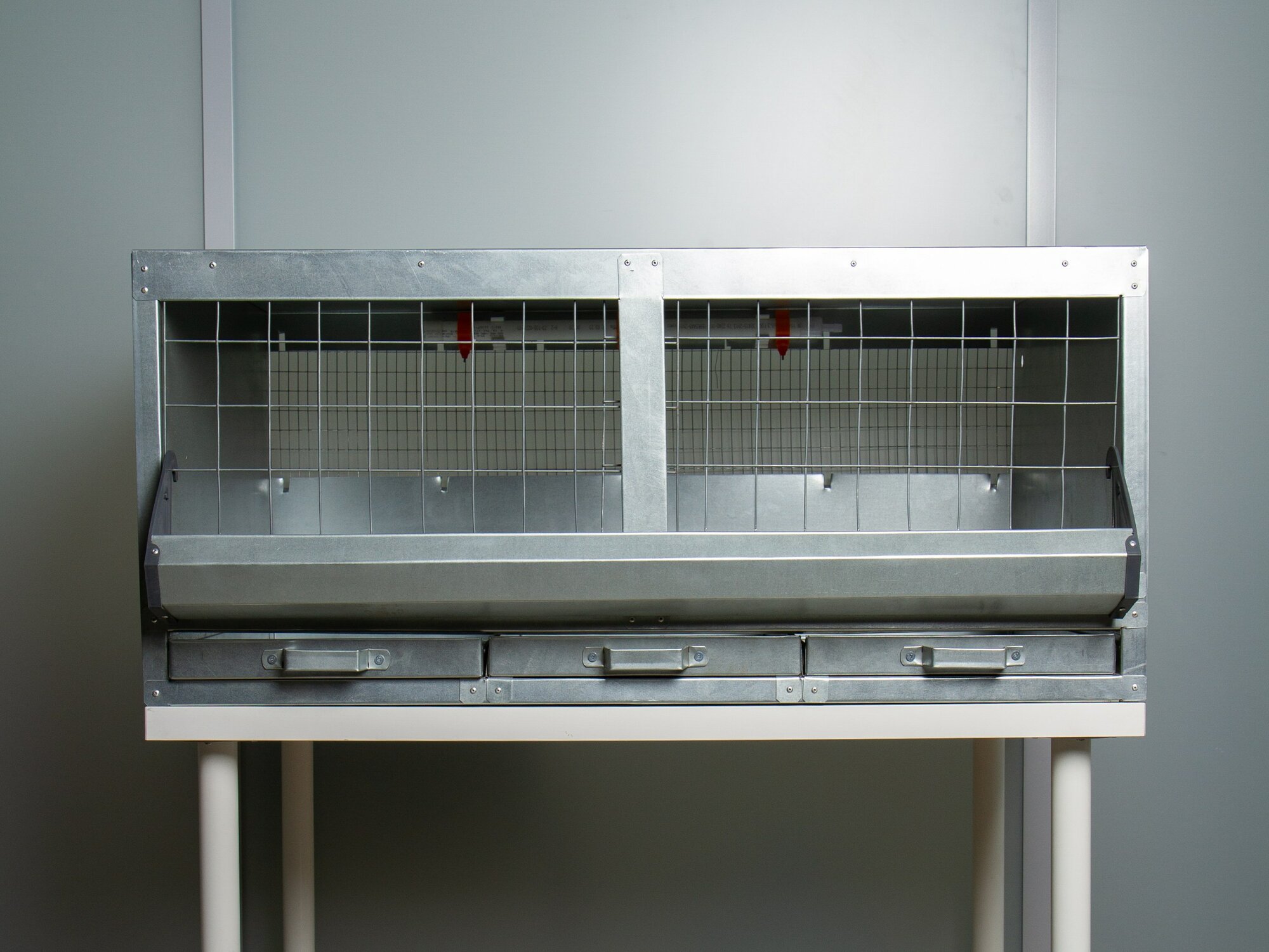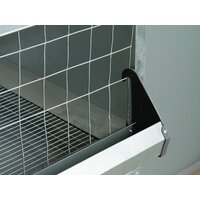 Модификация клетки позволяет быстро собрать ее в клеточную батарею. Задняя стенка клетки частично открыта, это способствует воздухообмену в клетке. Все три стенки выполнены с отбортовкой, что препятствует попаданию помета за пределы поддонов. Кормушка съемная, выполнена с отбортовкой из оцинкованного листа. Детали клетки легко моются перед посадкой новой партии птицы. Клетка оснащена ниппельной системой поения. Сетка пола 25*25*2 мм для взрослых особей выполнена горячим цинкованием. Поддоны 520*490*3 мм (Д*Ш*Г) (выполнены из оцинкованного листа.).