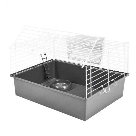 Клетка для кроликов металлическая на пластиковом поддоне. Разборная конструкция - 4 стенки и крыша. Передняя стенка является откидной дверцей. В комплект входит пластмассовый сенник (крепится снаружи прутьев), кормушка под морковку, миска 200мл. Расстояние между прутьев 25мм. Высота поддона - 14см. Цвет поддона - серый. Цвет прутьев - белый. Поставляется в сложенном виде. Состав: металл, полипропилен