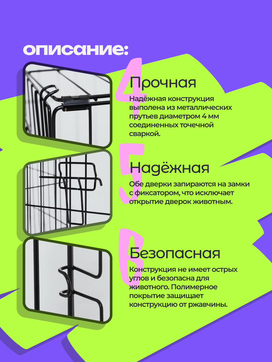 диаметр прутьев 3.2см, имеется 2 двери: передняя и боковая с надежными замками.