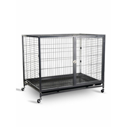 Прочная стальная клетка может использоваться как вольер для щенков, для содержания взрослых собак и кошек. Доступ к животным осуществляется через переднюю распашную дверцу и открывающийся распашной верх. Все двери оборудованы надёжными замками. Дно клети – сетчатое, под сеткой расположен выдвижной пластиковый поддон, который легко вынимается и моется. Для удобства перемещения клетки имеются колёса, которые устанавливаются в угловые каркасные трубки. Возможна эксплуатации клетки без колёс. Конструкция проста в сборке. Изготовлено из чёрных металлов (сталь) и пластика. Окрашено безопасной порошковой краской. Производство КНР.