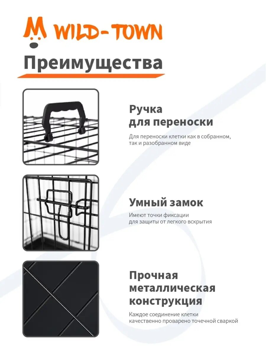 Клетка для собак подходит для содержания и перевозки питомца большого и среднего размера. Вольер изготовлен из прочных сплавов металла, которые способны выдержать большой вес и не подвергаются коррозии. Клетка вольер для собак легко собирается и разбирается в течение 60 секунд без специальных инструментов. Клетка для больших собак не представляет опасности для животных за счет полимерного покрытия. Конструкция благодаря выдвижному поддону быстро чистится и моется с использованием обычных моющих средств. Все детали изделия закруглены, поэтому питомец не нанесет себе вред. Клетка двухдверная для собак запирается при помощи особого механизма, который невозможно открыть изнутри, толщина прутьев в 4 мм. не позволяет повалить или сломать клетку животному. Клетка для собаки в квартиру имеет привлекательный внешний вид, компактность и переносную конструкцию. Вольер для собаки в квартиру станет для вашего питомца маленьким собственным жильем, где он сможет проводить время в отсутствие хозяина.