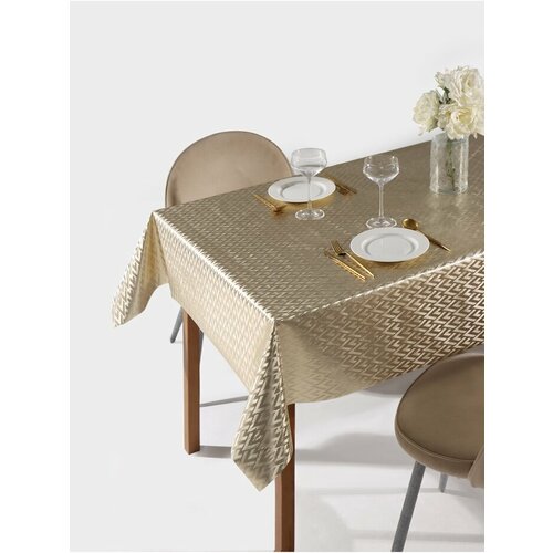 Прямоугольная форма и геометрический рисунок: клеёнка имеет прямоугольную форму с размерами 2000x137 см, что позволяет покрыть большую площадь стола. Геометрический рисунок золотистого цвета придает изделию изысканный и стильный вид.
