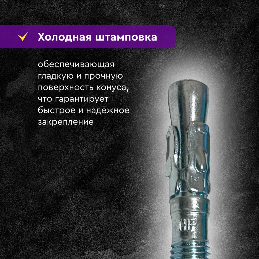 Для фиксации в сжатой зоне бетона и природном камне. Контролируемое расклинивание внутри отверстия при затяжке до требуемого момента. Удерживает нагрузку за счет сил трения и упора расклиненных частей. Используется для больших и средних нагрузок не теряет несущей способности при изгибе тела анкера. материал: Углеродистая сталь холодного формирования. Гальванизированная. Покрытие не менее 5 мкм. применение: • Крепление несущих металлических конструкций (опорные элементы колонн, балок) • Крепление оборудования • Крепление кронштейнов навесных и фасадных систем • Монтаж лифтовых направляющих • Крепление стоек ограждений и т. д. Диаметр резьбы: М12. Диаметр установки: 12 мм. Длина анкера: 90 мм. Материал: оцинкованная сталь. Покрытие: оцинкованный. Тип фасовки: шт. Фасовка: 50 шт. ГОСТ: нет. DIN: нет.