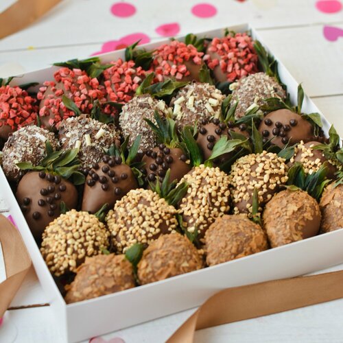 Набор из клубники в бельгийском молочном шоколаде с добавлением декора из хрустящих посыпок и сублимированной клубники - порадуй свою половинку Очень классный, популярный и вкусный подарок для любимой девушки, парня, мужа, жены, мамы, бабушки, доченьки или сестрёнки, подружке, коллеге на работе или возлюбленной. Такой подарок никого не оставит равнодушным! Данный набор отлично подойдёт в качестве подарка на любой праздник или побаловать своих любимых и близких Рекомендуем употребить продукцию, содержащую свежие ягоды, в течение первых 12 часов после покупки