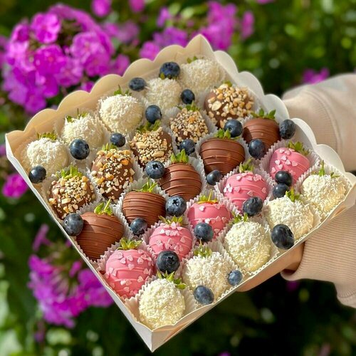 Мы готовим наборы из свежей клубники, используя ягоды, которые поступают к нам ежедневно. Размер клубники может меняться — а вместе с ним и количество ягод в коробке.