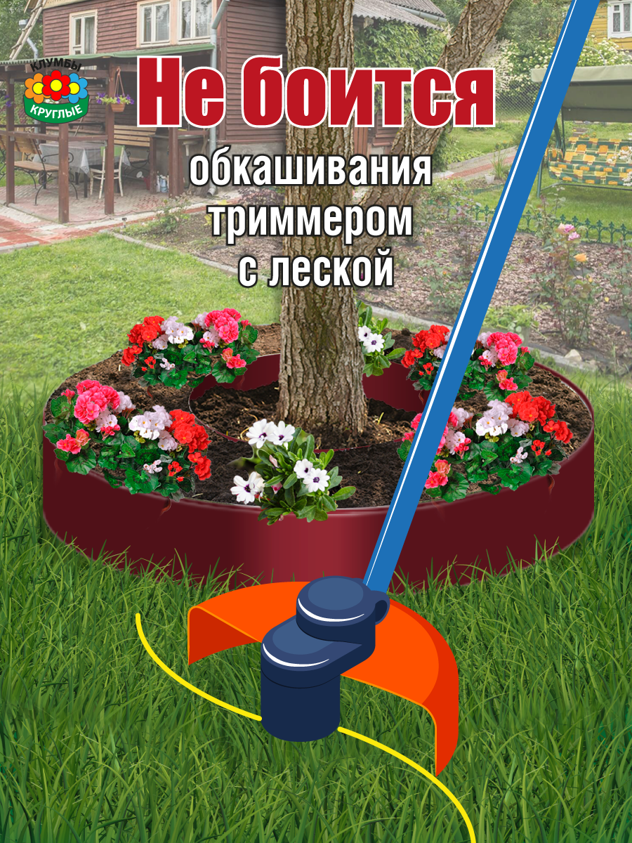 - Давление земли изнутри ограждения клумбы распределяется равномерно. При такой конструкции нет необходимости в применении дополнительных ребер жесткости, подпорок, колышков, как в прямоугольных клумбах.