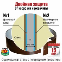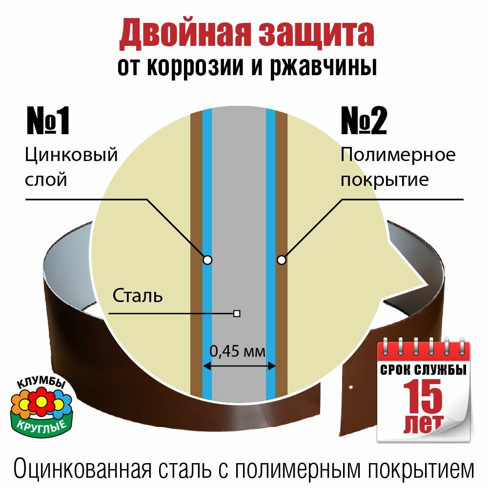 Основным преимуществом бордюра для клумбы является его двойная защита. Он изготовлен из оцинкованной стали, которая обеспечивает ему прочность и стойкость к коррозии. Кроме того, оцинкованная клумба имеет полимерное покрытие, которое защищает ее от внешних воздействий, таких как дождь, снег и солнце и увеличивает срок службы.