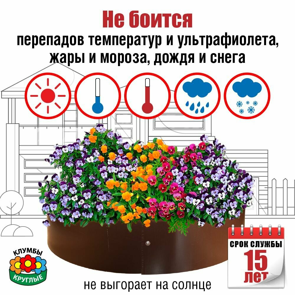 Конструкция садовой клумбы хорошо проработана. Каждое полукольцо надежно соединено с другими, обеспечивая прочность и устойчивость ограждения. Благодаря этому, клумба легко справляется с нагрузкой почвы и растений, сохраняя свою форму и внешний вид на протяжении долгого времени.