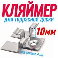 Кляймер для террасной доски дпк 10 мм – это крепежный элемент, предназначенный для скрытого монтажа террасной доски из ДПК (декинг) с образованием небольшого зазора между досками для отвода влаги и естественной вентиляции между террасными досками. Крепление террасной доски ДПК с помощью кляймера осуществляется к поперечным лагам шириной от 40 мм. Крепеж террасной доски ДПК изготавливается из нержавеющей стали, способствующей установке снаружи помещения, без образования налета и ржавчины. Кляймеры для дпк доски используют для настила поверхности балконов, террас, выставочных залов и других помещений. Особенности: • Материал: нержавеющая сталь • Высота язычка: 10мм • Толщина: 0,8 мм • Длина: 35 мм • Ширина: 36 мм • Тип: шовный (с зазором) • Размер зазора: 5-6 мм • Для террасной доски: ДПК (декинг) • Цвет: серебристый • Диаметр самореза: 4 мм Преимущества: • Надежное крепление: обеспечивает прочное и долговечное соединение террасной доски к основанию, выдерживая значительные нагрузки. • Скрытый монтаж: невидимы