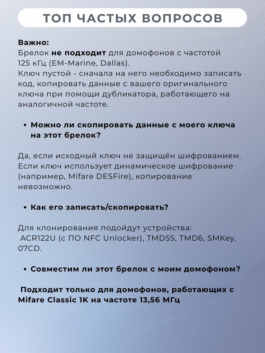 Бесконтактная заготовка для создания копий RFID брелоков/карт не содержит кода, поэтому для внесения в домофон, на заготовку необходимо скопировать код с уже имеющегося домофонного ключа.