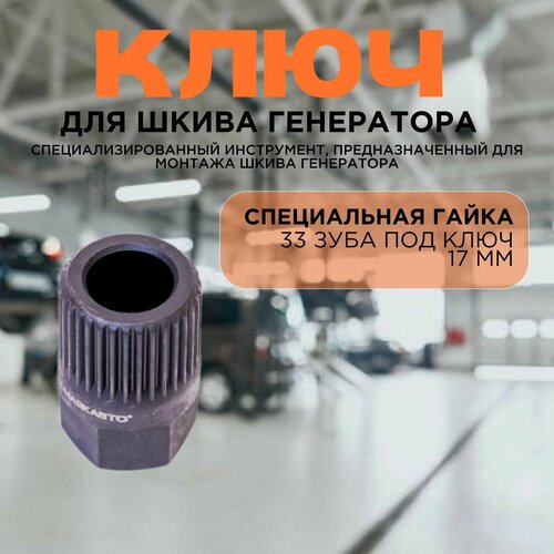 Ключ для шкива генератора 33 зуба маякавто специализированное приспособление для обслуживания генератора. Ключ предназначен для снятия и установки шкивов генератора с муфтой свободного хода . Съёмник для шкива генератора находит широкое применение в сервисных центрах, на СТО и в других различных мастерских по ремонту автомобилей. Ключ генератора используют для снятия и крепления шкивов генератора WV, Audi, Mersedes.