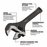 Ключ разводной цельностальной Dewalt DWHT80269-0, максимальный размер - 12 дюймов (300 миллиметров). Инструмент имеет конструкцию, обеспечивающую минимальное перемещение между фиксированной и подвижной губками для точной регулировки ключа. Это ключ с широким разведением губок для работы с широким рядом крепежных элементов. Лазерная гравировка шкалы для удобства точной регулировки. Расширяющаяся в задней части рукоятка разработана специально для предотвращения выскальзывания ключа во время работы.