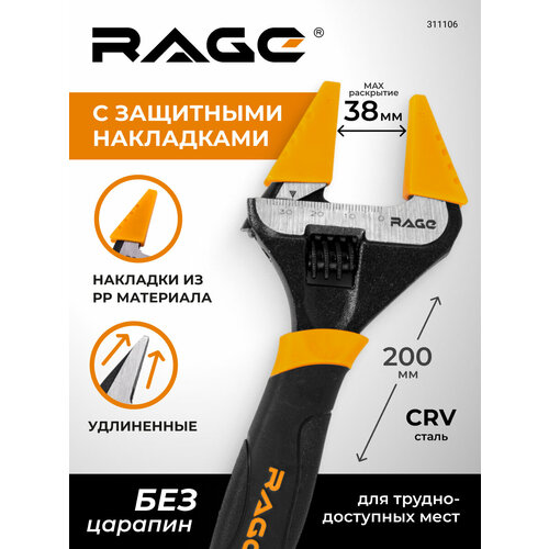 Ключ разводной с тонким губками и защитными насадками 200 мм RAGE