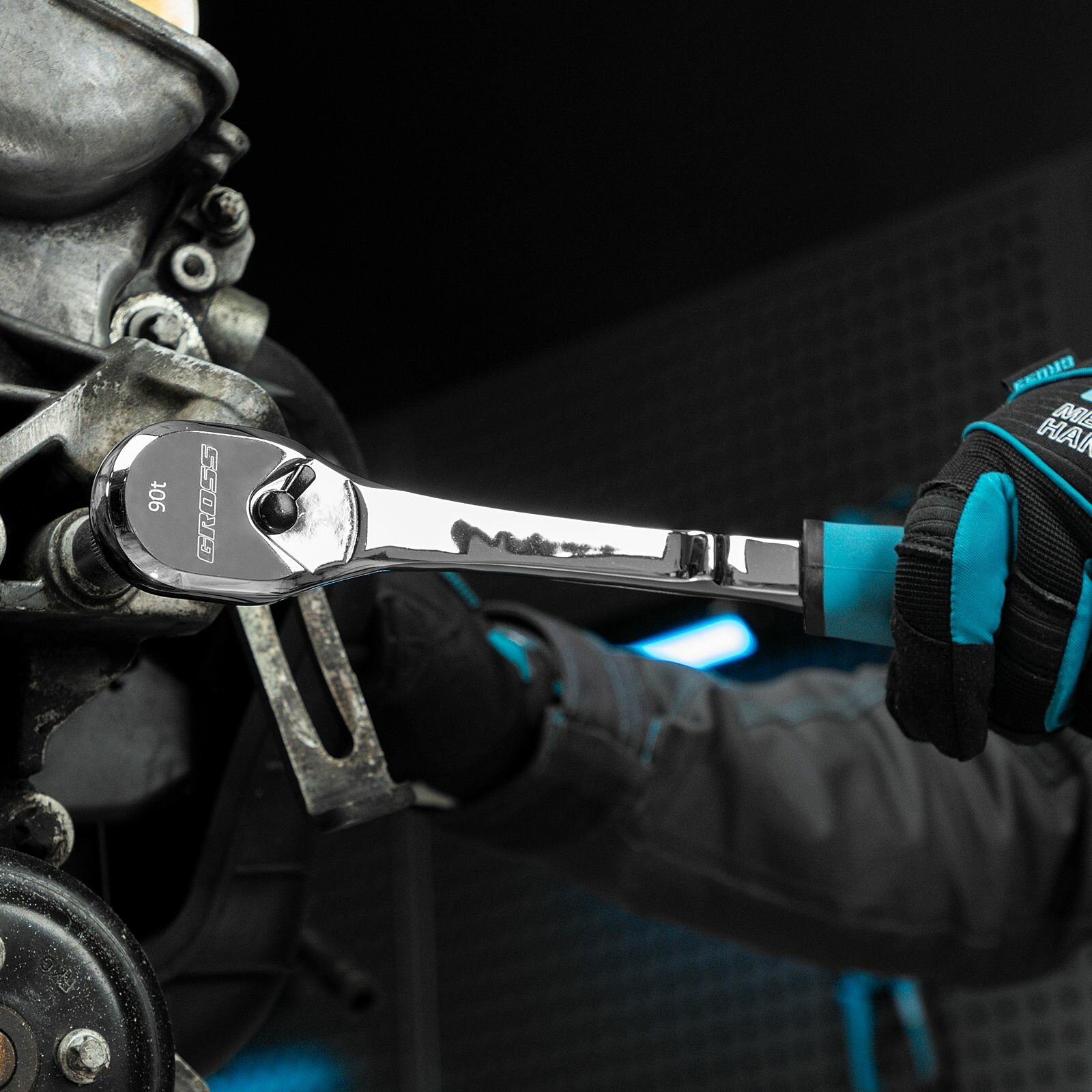 Усиленный ключ-трещотка Gross 14055 с присоединительным квадратом 1/2" оснащен храповым механизмом с 90 зубьями. Предназначен для установки торцевых головок, а также адаптеров и удлинителей с посадочным отверстием соответствующего размера. Шаг храпового механизма составляет 4°, поэтому инструмент оптимален для использования в труднодоступных местах. Будет полезен в сервисном центре, на СТО, а также пригодится дома или в поездке.ПреимуществаПрочность и износостойкость — инструмент изготовлен из закаленной хромованадиевой стали твердостью 50-55 HRC.Защита от разрушения — на поверхность ключа нанесено антикоррозионное хромовое покрытие.Надежность — усиленный удлиненный корпус выдерживает повышенные нагрузки.Удобная работа — храповой механизм обеспечивает плавное вращение.Мгновенное переключение между задачами — направление вращения меняется одним движением при помощи металлического переключателя.Надежная фиксация — шариковый фиксатор крепко удерживает насадку.Эргономичность — двухкомпонентная маслобензостойкая рукоятка обеспечивает комфортную и безопасную работу.