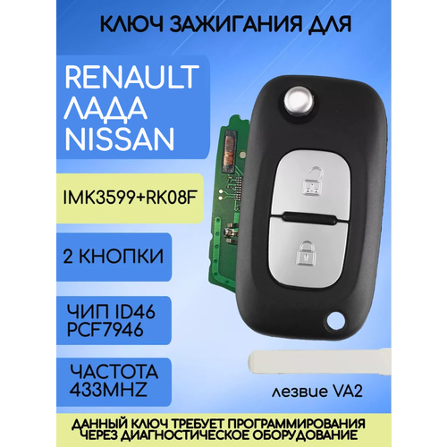 Выкидной ключ зажигания автомобиля с 2 кнопками для Рено / Renault / Лада Ларгус / Nissan (MK3599+RK08F). Данный ключ требует программирования через диагностическое оборудование. Ключ с 2 кнопками, частота 433 Мгц с чипом ID46 PCF7946. Лезвие VA2. Батарейка в комплекте. Совместимость : Renault Duster ( 2011 - 2015 ); Renault Logan ( 2005 - 2012 ); Лада Largus; Nissan Almera G15.