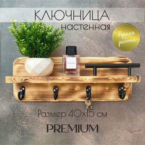 Деревянная ключница — идеальный выбор для тех, кто ценит уют и стиль в интерьере. Этот органайзер для ключей не только добавит изысканности вашей прихожей, но и обеспечит идеальный порядок. Изготовленная из экологически чистого дерева, каждая ключница ручной работы является уникальным произведением искусства, способным украсить любое пространство — будь то квартира, частный дом или дача. Ключница из дерева с функциональной полкой и крючками гарантирует, что ваши ключи всегда будут под рукой. Полка идеально подходит для размещения ароматизаторов, создавая приятную атмосферу сразу при входе в дом, а также можно разместить горшки с цветами, фоторамки или декоративные статуэтки. Полка с крючками на стену может быть использована на кухне как стильное решение для хранения полотенец, декоративной посуды, специй, или даже как подставка для комнатных растений и любимых безделушек. Данная ключница выполнена технологией обжига и покрыта защищающей прозрачной пропиткой по дереву, имеет естественный вид натурального дерева. Каждая ключница имеет свою текстуру и рисунок, может не совпадать с тем что изображено на фото. ✓ Материал – натуральное дерево; ✓ Высота – 15 см; ✓ Ширина – 40 см; ✓ Глубина – 11 см; ✓ Не требует сборки; ✓ Качественная металлическая фурнитура; ✓ Крепления в комплекте; ✓ Произведено в России; ✓ Ручная работа. Если вы ищете что-то особенное, Chiwoodo также предлагает ключницы на любой размер и цвет, чтобы вы могли иметь идеальный аксессуар, соответствующий вашему вкусу и потребностям. Желаем Вам приятных покупок!