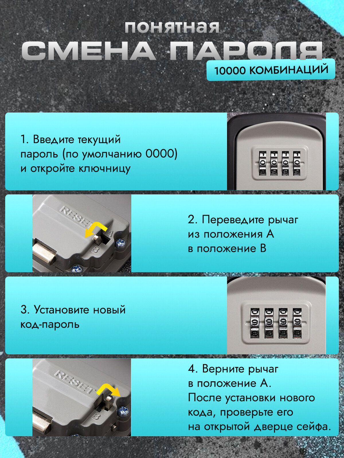 Настенная ключница с кодом, или мини сейф - отличное решение для безопасного хранения ключей, карт, денег, или других небольших предметов. Сейф для ключей закрывается на кодовый замок. Вы можете установить любой код из 4-х символов, а это значит что сейф обладает высокой безопасностью.