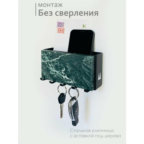 Ключница выполнена в современном дизайне, который подойдет для любого интерьера. Цвет товара - малахит на черном, что придает ему элегантный и стильный вид.