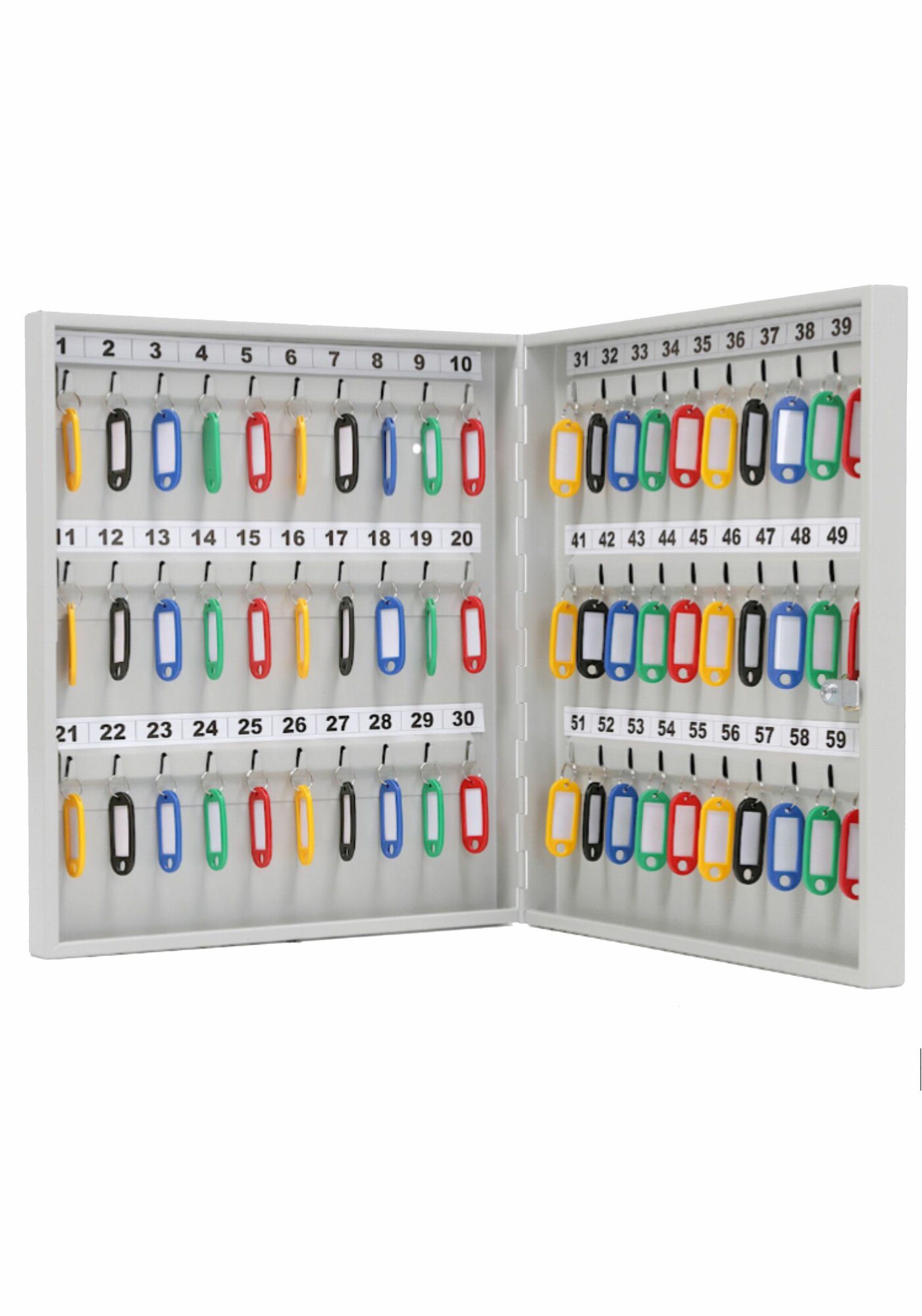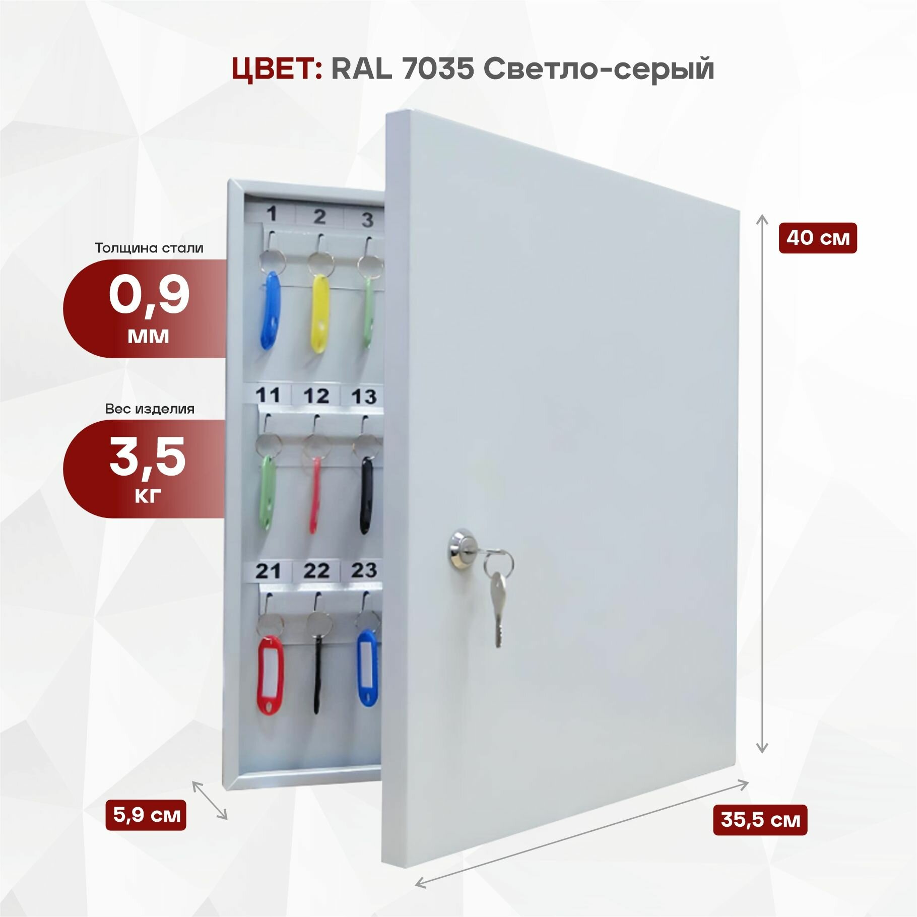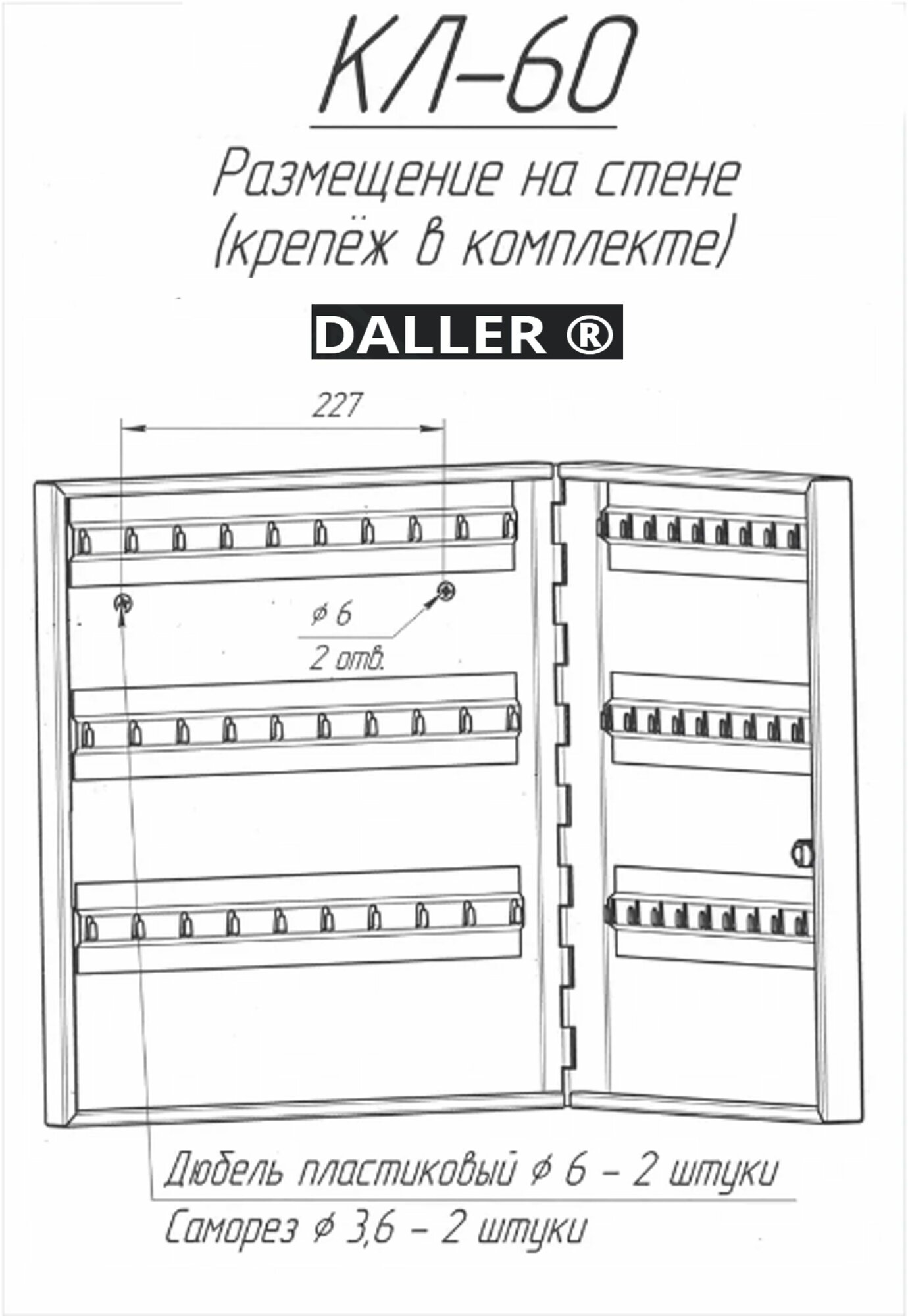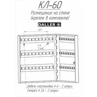 Ключница КЛ 60 с брелками производится на заводе "Рубин", который вот уже более 19 лет занимается производством изделий из углеродистой стали. Все линейка производимой продукции выпускается под зарекомендовавшим себя брендом DALLER. Металлическая настенная ключница изготовлена из стали 0,9мм. Настенная ключница устанавливается через отверстия для крепления(крепеж идет в комплекте). Ключница оснащена надежным ключевым замком, крючками для вешания ключей, а так же брелоками из пластика в количестве 60 штук и самоклеющимися номерками. Ключница на стену с брелками прочный и надежный вариант как для частного использования так и для организаций с большим количеством помещений таких как гостиница, хостел, отель, офисный центр, общежитие, больница, школа, общеобразовательное учреждение, везде, где есть необходимость хранения большого количества ключей под надежной защитой. Ключницу-шкаф металлическую можно использовать, как сейф-ключницу. Сейф для ключей обеспечит надежную сохранность любому содержимому, благодаря встроенному флажковому замку. Настенный шкаф для ключей простой в монтаже, может крепиться к стене из любого материала, для его установки потребуется 10 минут времени и дрель. Прочная, порошковая покраска серого полуматового цвета (RAL 7038) закрытого шкафчика для ключей на долгие годы сохранит внешний вид изделия. Закрытый шкаф позволяет осуществлять контроль за взятием и возвратом ключей. Все ключи в одном месте! Покупая у нас, Вы покупаете у прямого производителя!