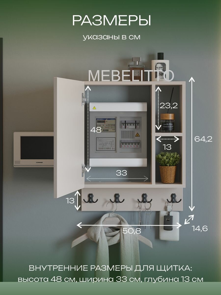 Представляем вам настенную ключницу с металлическими крючками, открытыми полочками и закрытой нишей, в которую можно спрятать электрощиток или WI - FI роутер! Это красивая и качественная мебель, которая станет украшением интерьера дома, квартиры или дачи. Она поможет организовать дополнительное место для хранения ключей, автомобильных брелков и других мелочей. Надежно закрепленные на саморезы двойные крючки (4 штуки) позволяют использовать подвесную ключницу как вешалку для аксессуаров. Ниша с закрывающейся дверцей вмещает 18-ти модульный распределительный щиток. На полочках будут красиво смотреться декоративные предметы интерьера, например, фотографии и диффузор. На них можно положить телефон. Эстетичный интерьерный органайзер в трендовом стиле минимализм можно повесить на стенку в коридоре и прихожке. Он поставляется с набором необходимого для установки крепежа. Навесная ключница с полками и крючками — держателями поможет поддерживать порядок и добавит уюта входной зоне. Она станет практичным и функциональным элементом домашнего интерьера. Изделие с надежными креплениями позволяет разместить связки ключей, принадлежности для выгула собак и другие нужные вещи. Ключницу с боксом для щитка можно приобрести в качестве универсального подарка для женщин и мужчин. Она обрадует членов семьи и друзей. Это практичный презент для мамы с папой или брата с сестрой. Ключницу с кейсом можно вручить на день рождения и новоселье, 14 или 23 февраля и любой другой праздник.