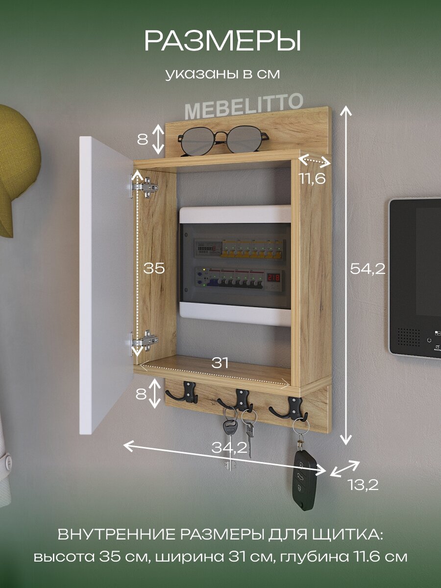 Закрытый отдел легко вместит в себя электрический щиток до 18 модульного. Скроет щиток и добавит уюта в прихожей.