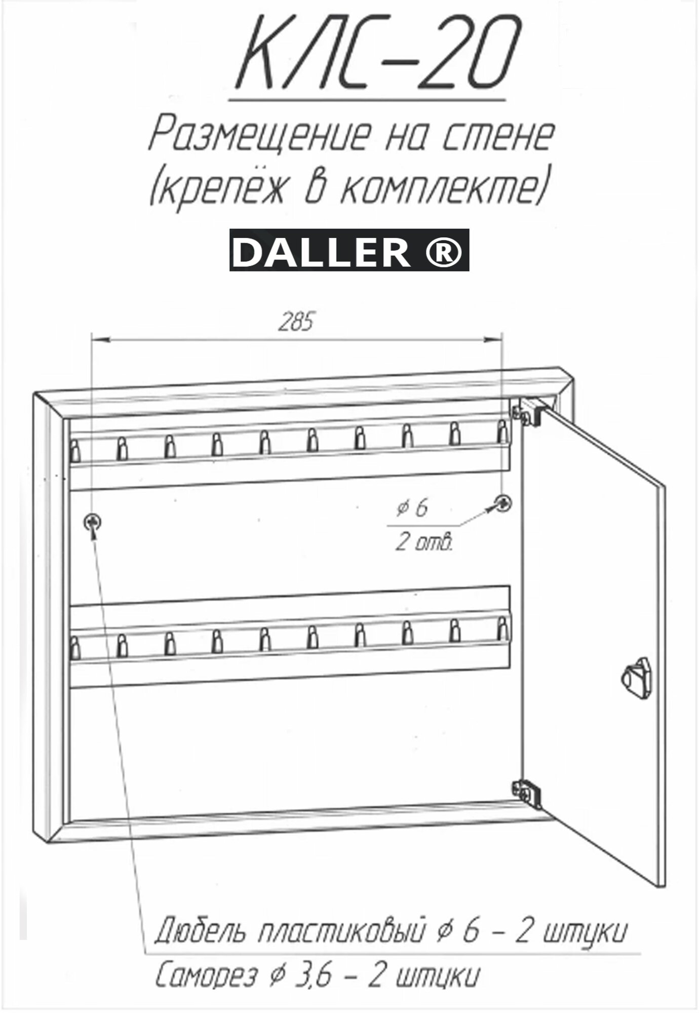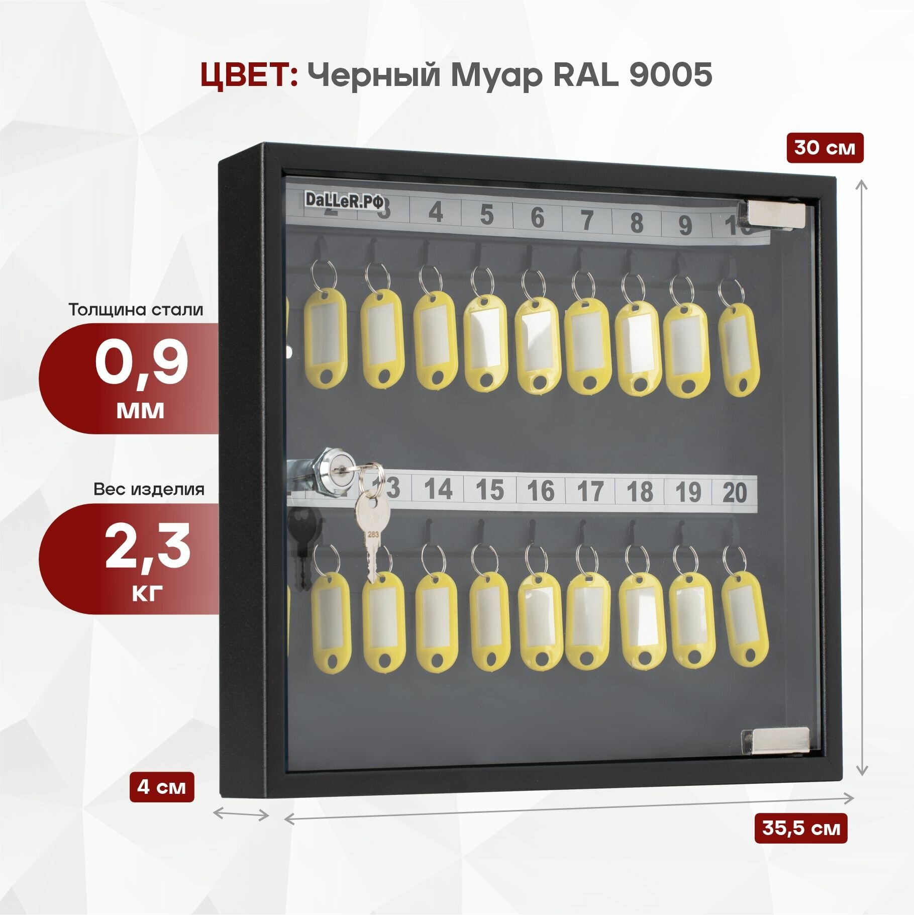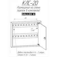 Ключница КЛС 20 с брелками производится на заводе "Рубин", который вот уже более 19 лет занимается производством изделий из углеродистой стали. Все линейка производимой продукции выпускается под зарекомендовавшим себя брендом DALLER. Металлическая настенная ключница с прозрачной дверцей, которая ускорит поиск нужного ключа, изготовлена из стали 0,9мм. Настенная ключница устанавливается через отверстия для крепления(крепеж идет в комплекте). Ключница оснащена надежным ключевым замком, крючками для вешания ключей, а так же брелоками из пластика в количестве 20 штук и самоклеющимися номерками. Ключница на стену с брелками прочный и надежный вариант как для частного использования так и для организаций с большим количеством помещений таких как гостиница, хостел, отель, офисный центр, общежитие, больница, школа, общеобразовательное учреждение, везде, где есть необходимость хранения большого количества ключей под надежной защитой. Ключницу-шкаф металлическую с прозрачной дверцей из органического стекла можно использовать, как сейф-ключницу. Сейф для ключей обеспечит надежную сохранность любому содержимому, благодаря встроенному флажковому замку. Настенный шкаф для ключей простой в монтаже, может крепиться к стене из любого материала, для его установки потребуется 10 минут времени и дрель. Прочная, порошковая покраска цвета черный муар (RAL 9005) закрытого шкафчика для ключей на долгие годы сохранит внешний вид изделия. Закрытый шкаф с прозрачной дверью позволяет осуществлять контроль за взятием и возвратом ключей. Ключница с прозрачной дверцей поставляется в индивидуальной упаковке, обеспечивающей сохранность во время транспортировки. Все ключи в одном месте! Покупая у нас, Вы покупаете у прямого производителя!