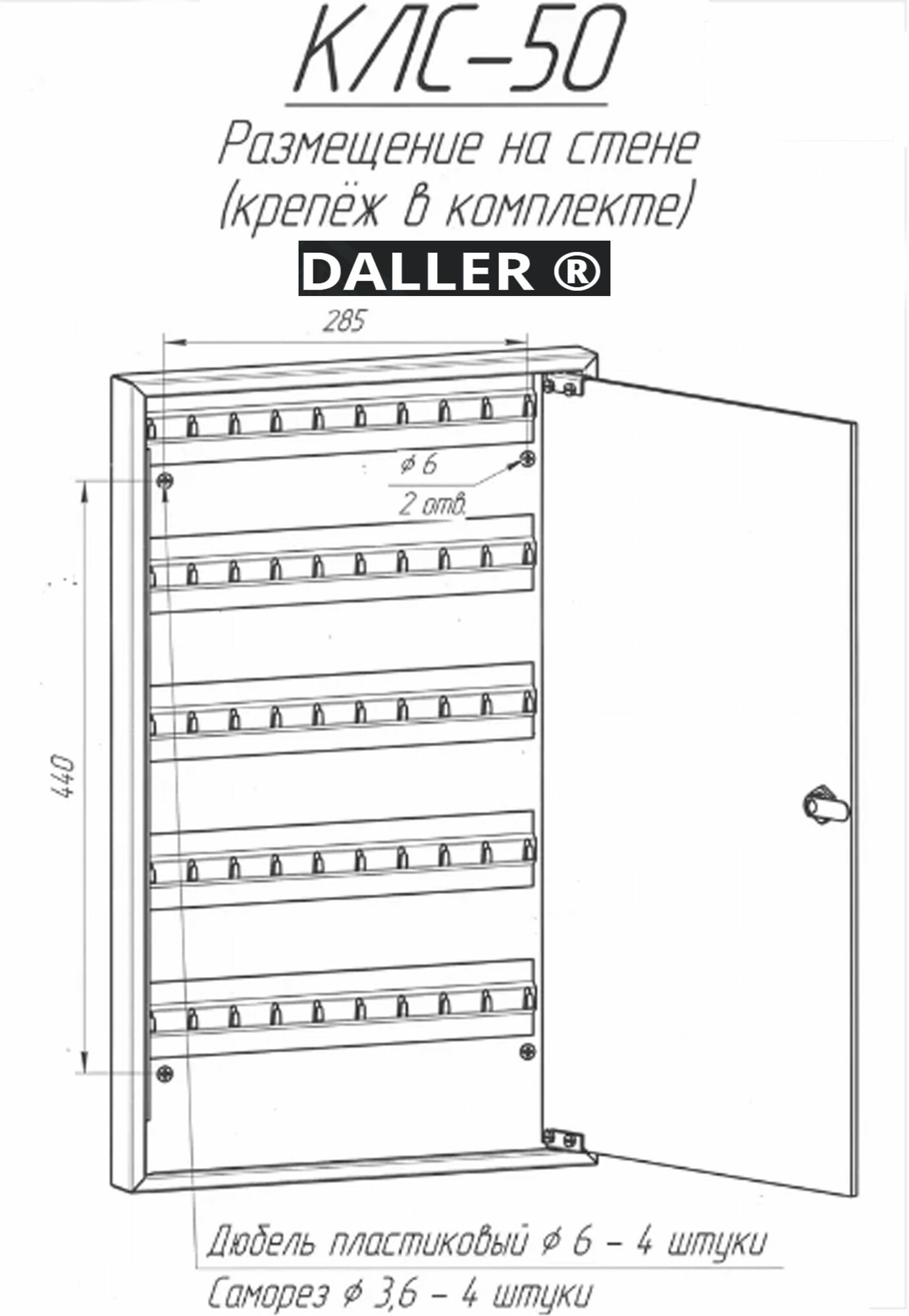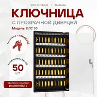 Ключница КЛС 50 с брелками производится на заводе "Рубин", который вот уже более 19 лет занимается производством изделий из углеродистой стали. Все линейка производимой продукции выпускается под зарекомендовавшим себя брендом DALLER. Металлическая настенная ключница с прозрачной дверцей, которая ускорит поиск нужного ключа, изготовлена из стали 0,9мм. Настенная ключница устанавливается через отверстия для крепления(крепеж идет в комплекте). Ключница оснащена надежным ключевым замком, крючками для вешания ключей, а так же брелоками из пластика в количестве 50 штук и самоклеющимися номерками. Ключница на стену с брелками прочный и надежный вариант как для частного использования так и для организаций с большим количеством помещений таких как гостиница, хостел, отель, офисный центр, общежитие, больница, школа, общеобразовательное учреждение, везде, где есть необходимость хранения большого количества ключей под надежной защитой. Ключницу-шкаф металлическую с прозрачной дверцей из органического стекла можно использовать, как сейф-ключницу. Сейф для ключей обеспечит надежную сохранность любому содержимому, благодаря встроенному флажковому замку. Настенный шкаф для ключей простой в монтаже, может крепиться к стене из любого материала, для его установки потребуется 10 минут времени и дрель. Прочная, порошковая покраска цвета черный муар (RAL 9005) закрытого шкафчика для ключей на долгие годы сохранит внешний вид изделия. Закрытый шкаф с прозрачной дверью позволяет осуществлять контроль за взятием и возвратом ключей. Ключница с прозрачной дверцей поставляется в индивидуальной упаковке, обеспечивающей сохранность во время транспортировки. Все ключи в одном месте! Покупая у нас, Вы покупаете у прямого производителя!
