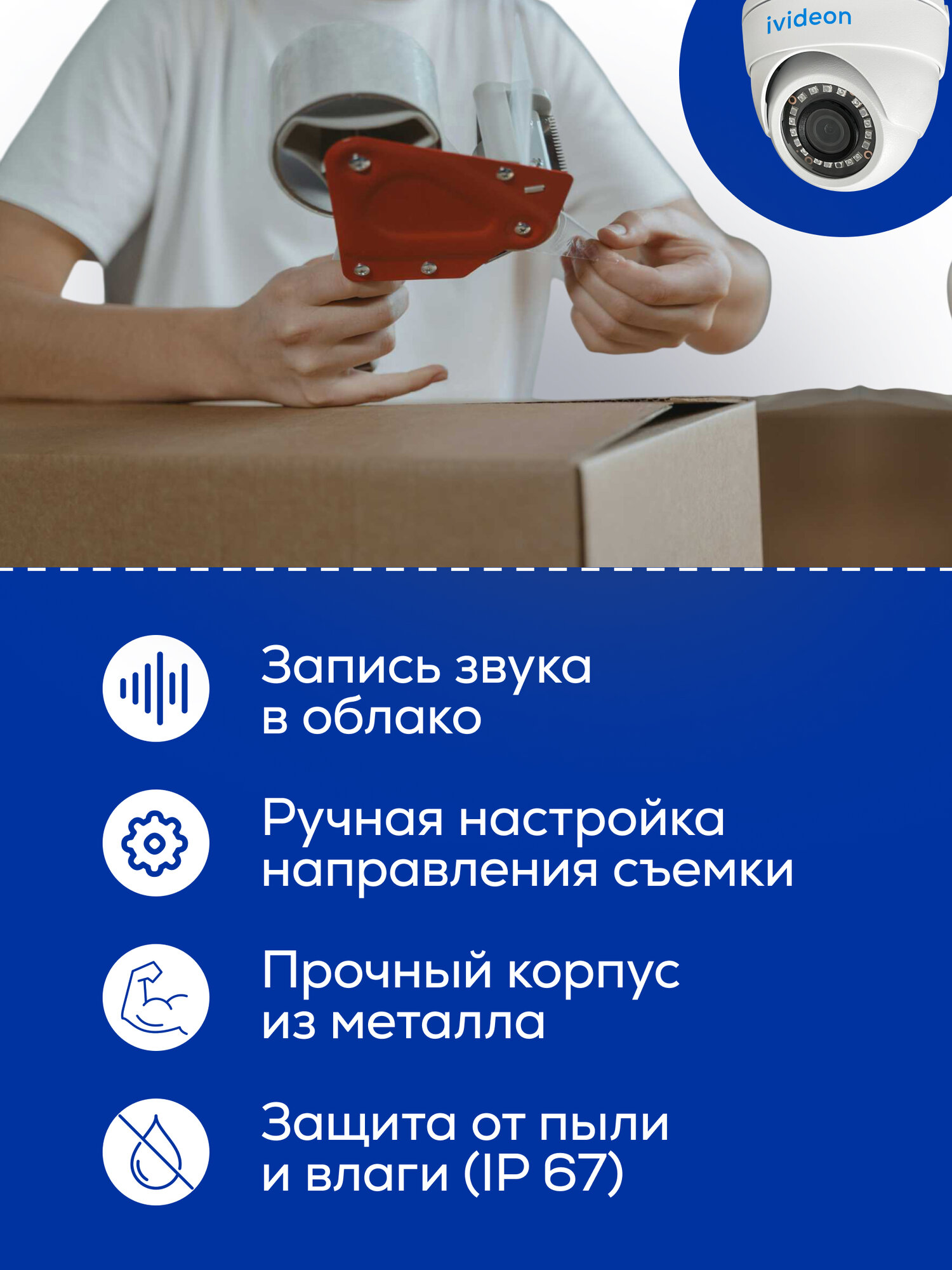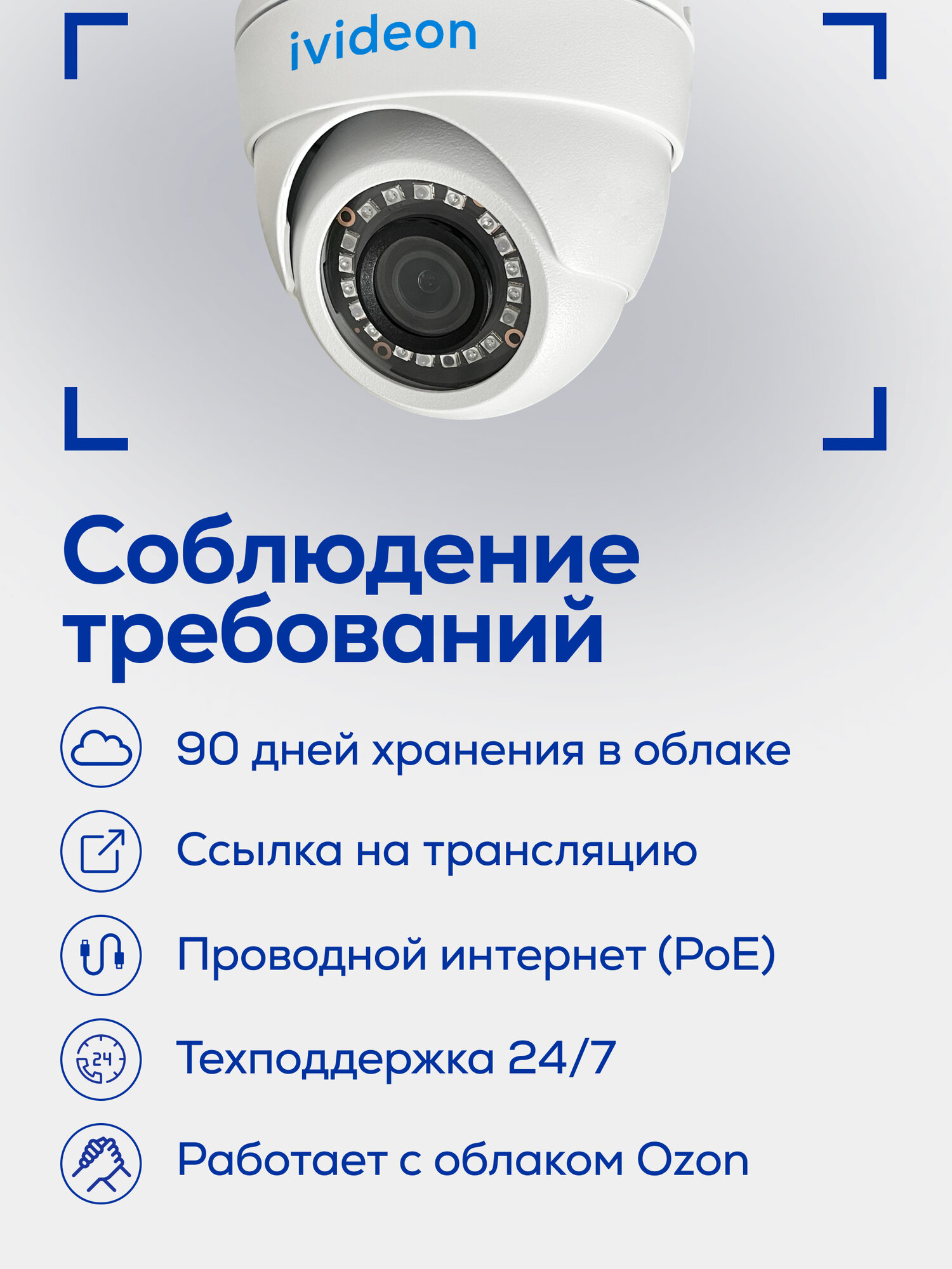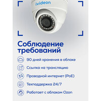 Ivideon-6220F-MV3 — купольная IP видеокамера для пунктов выдачи заказов (ПВЗ). Это надежное решение для контроля за безопасностью в ПВЗ с соблюдением требований маркетплейсов: хранение видео в облаке 90 дней, ссылка на трансляцию, захват экрана и подключение к интернету по проводу. — Снимает в Full HD (1920x1080) при 25 кадрах в секунду, обладает разрешением 2 Мп и матрицей 1/2,9" Progressive Scan CMOS — Обладает широким углом обзора в 98° и фиксированным объективом 2.8 мм — В камеру встроена инфракрасная подсветка с дальностью до 20 метров, что обеспечивает четкое изображение даже в условиях низкой освещенности — Поддерживает кодеки видеосжатия H.264 и H.265 — Технологии улучшения изображения: 3D DNR, BLC, HLC, DWDR, ROI — Поддерживает интеллектуальные функции: детекция движения, детектор людей, пересечение линий, обнаружение вторжения — Обладает встроенным микрофоном с поддержкой аудиокодеков G.711A/U, G.726, AAC для качественной записи звука — Подключается по PoE или LAN для более стабильного соединения — Устойчива к температурным колебаниям от -40°C до +60°C, защищена от пыли и влаги по протоколу IP67 — Корпус выполнен из металла для защиты от внешних воздействий — Обладает компактными размерами (80 x 94 мм) и весом в 360 г. Услуга облачного сервиса оказывается АО "Мобильные Видеорешения".