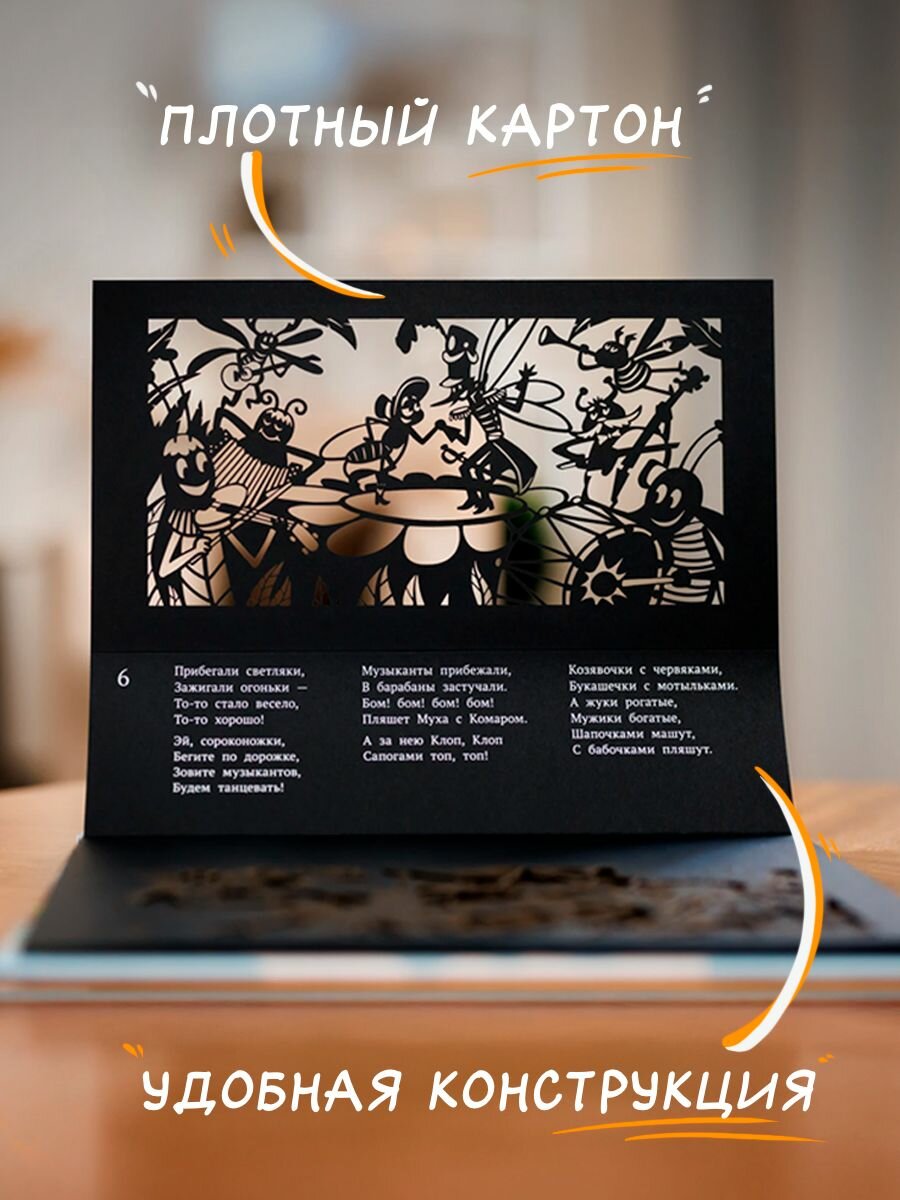 Книга SHADOW PLAY "Муха-Цокотуха" станет отличным подарком для девочки и мальчика на любой праздник, будь то выпускной в детском саду или день рождения.