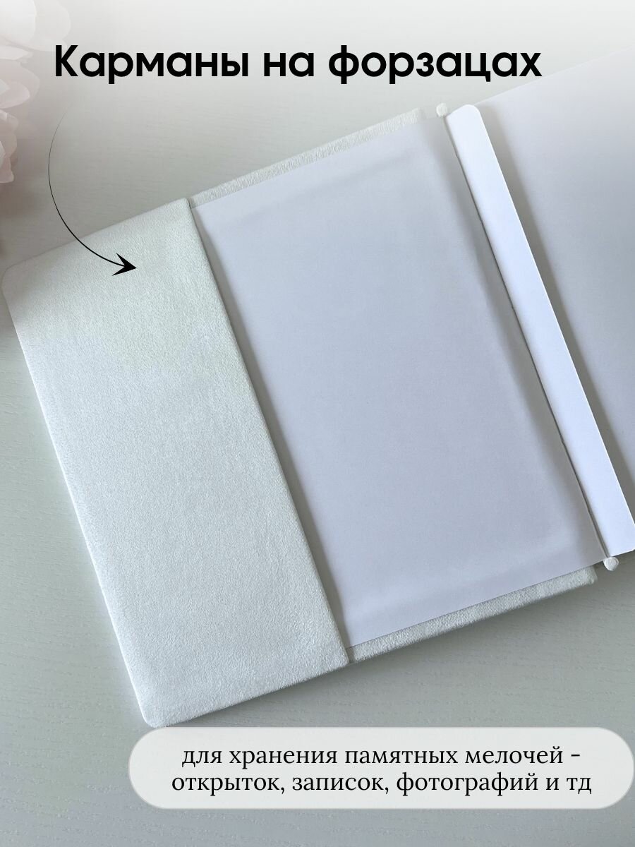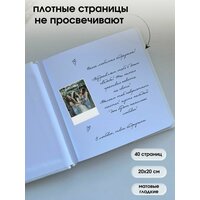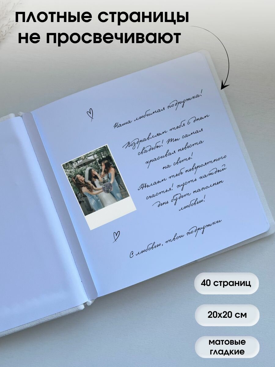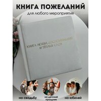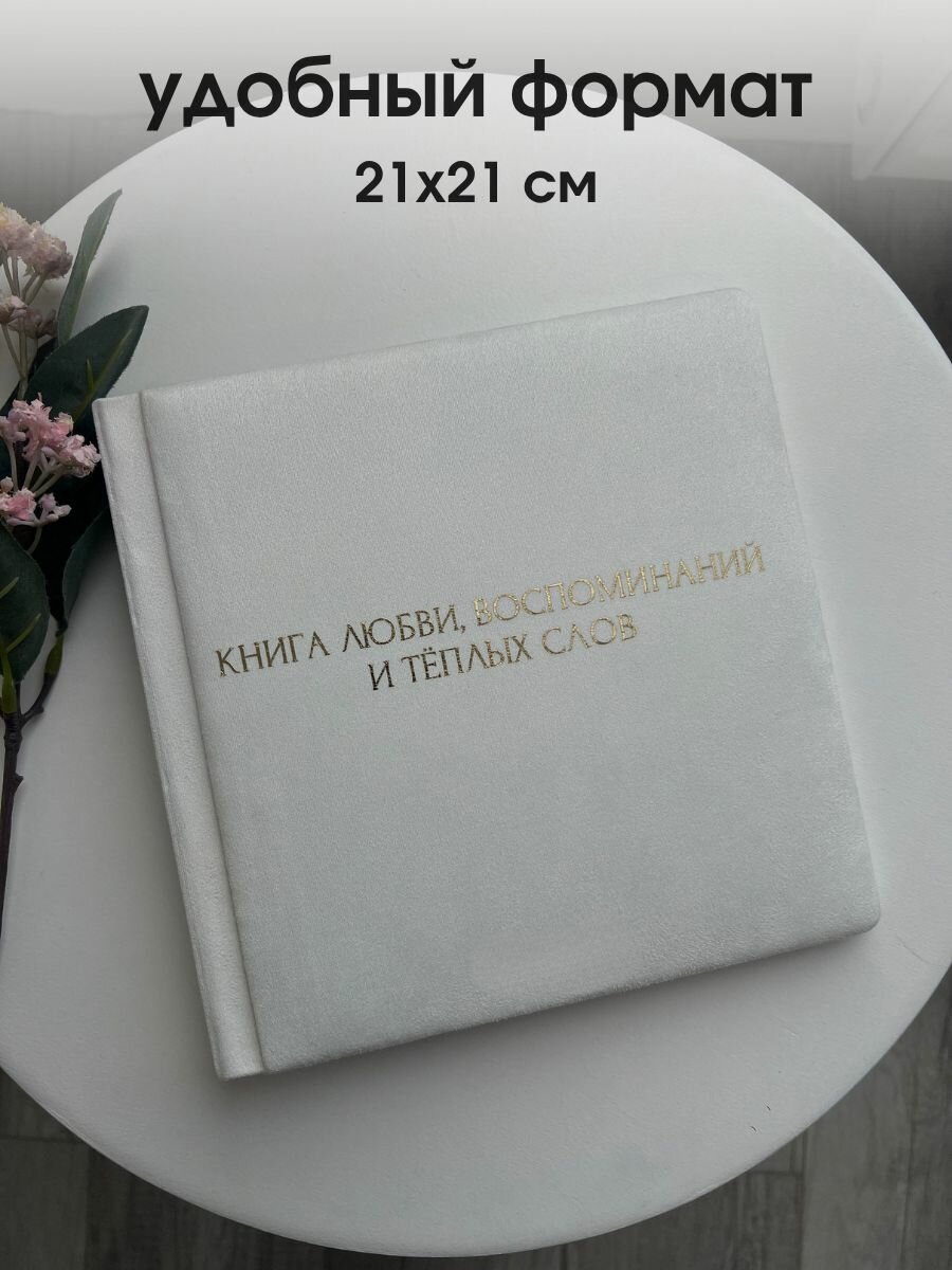 Обложка из искусственной замши белого цвета, книга идеально сочетается с любой атмосферой — будь то романтичная церемония или тёплая встреча друзей. Компактный формат позволяет легко разместить её на столике, а 40 плотных белых страниц размера 20х20 см обеспечат место для самых трогательных строк. Создана специально для сбора душевных поздравлений, советов и пожеланий, которые станут частью вашей истории.