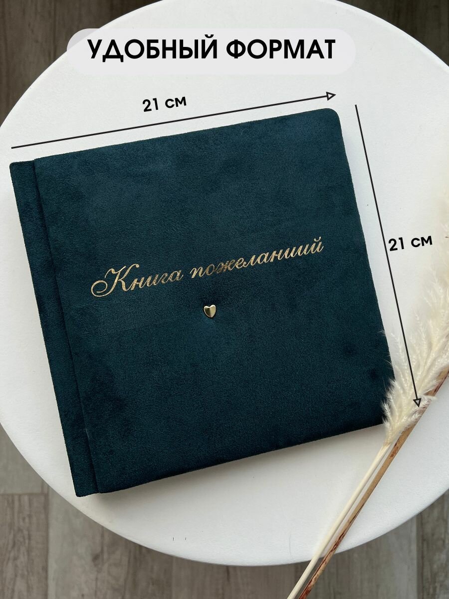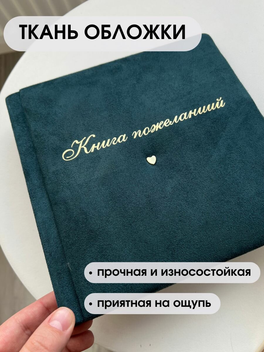 Книга выполнена из искусственной замши, страницы из плотной матовой гладкой дизайнерской бумаги. Красивое оформление делает её прекрасным элементом декора и поводом для обсуждения среди приглашенных. Высококачественная бумага обеспечит сохранность записей, а оригинальная обложка подарит эстетическое наслаждение.