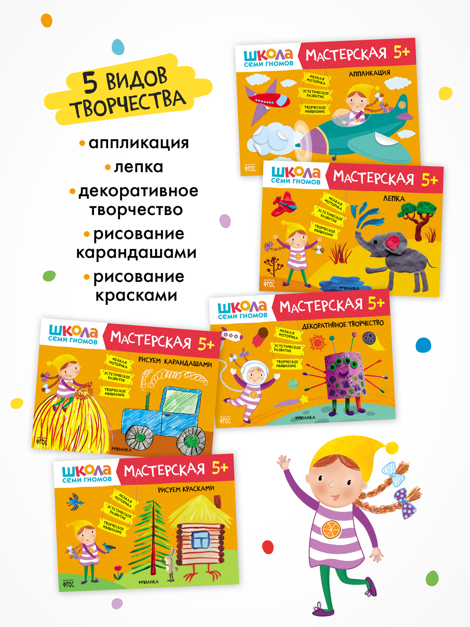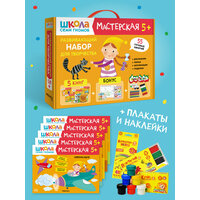 «Школа Семи Гномов. Мастерская 5+» включает в себя увлекательный набор альбомов с занятиями для детей от 5 до 6 лет и необходимые материалы: пластилин, карандаши и краски. Кроме того, внутри набора ждет приятный бонус — большой плакат (70Х50 см) для рисования по точкам, разработанный в соответствии с возрастными возможностями ребенка, обучающий плакат «Арифметика цвета» и поощрительные наклейки. С этим подарочным комплектом ваш ребенок откроет мир развивающих занятий и творчества. Пошагово, с увеличением сложности заданий, малыш погрузится в мир творчества, создавая уникальные поделки. Всего в программу комплекта входит 5 развивающих альбомов, по которым ребенок изучит разные виды творчества: аппликация, декоративное творчество, лепка, рисование карандашами и красками.