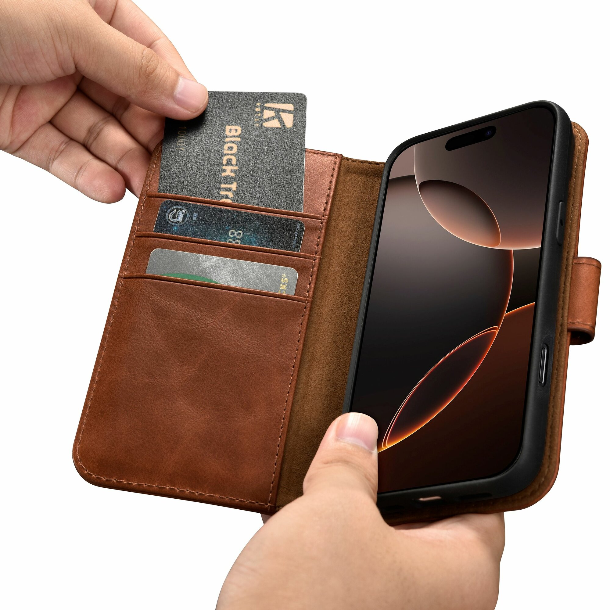 Многофункциональность этого кейса заключается в том, что он совмещает в себе функции чехла книжки и защитной накладки, предоставляя пользователю возможность легко трансформировать его в зависимости от ситуации и предпочтений. Вы можете использовать это чехол, как накладку или как книжку. Внутренний чехол из термополиуретана TPU плотно примагничивается к внешнему кошельку-книжке . На задней части он отделан вставкой из натуральной кожи. 3 внутренних кармана для карт и боковой карман для наличных делают этот чехол ещё более удобным, позволяя хранить документы, наличные, визитки и карты.