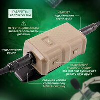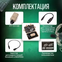 - Комплектация: Кнопка PTT V20 FCS, защитный пластиковый кейс, руководство пользователя на английском и китайском языке, коннектор подключения наушников с интерфейсом NATO U-174/u, адаптер подключения к радиостанциям Kenwood/BAOFENG, резиновые заглушки разъемов.
