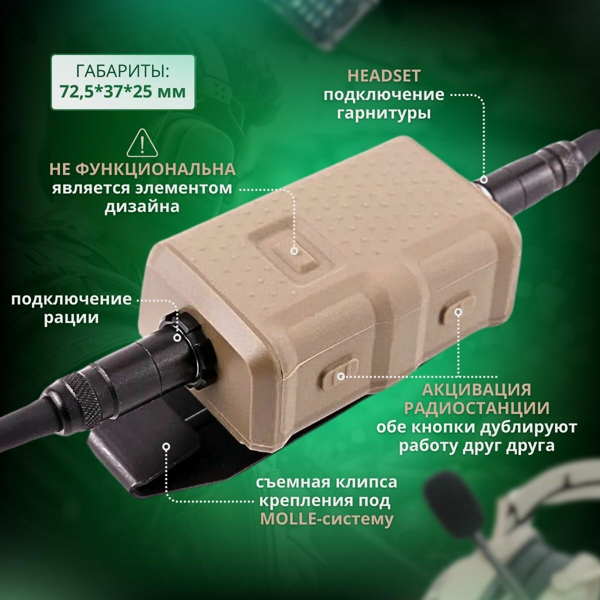 - Кнопка PTT V20 от известного производителя Falco Communications System. Используется для подключения Активных тактических стрелковых наушников FMA FCS AMP, а также наушников других производителей с коннектором интерфейса NATO U-174/u (особенныйная "military" распайка проводов) к радиостанции. В комплект поставки Кнопки PTT V20 входит адаптер подключения к радиостанциям Kenwood/BAOFENG.