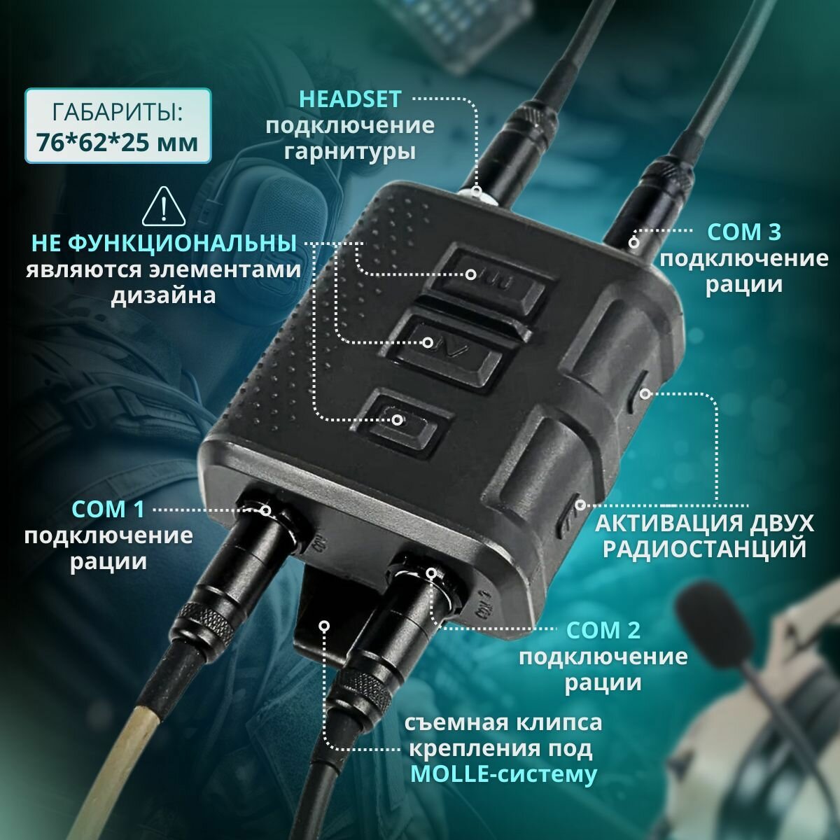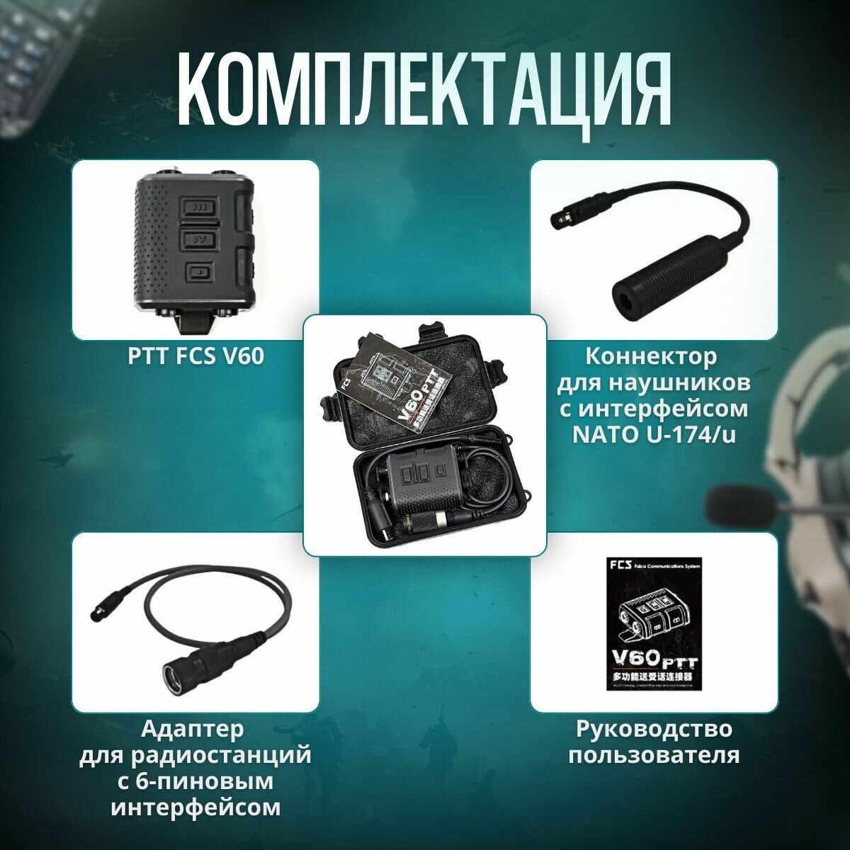 Габариты: 79х62х25 мм Комплектация: Кнопка PTT V60 FCS, защитный пластиковый кейс, руководство пользователя на английском и китайском языке, коннектор подключения наушников с интерфейсом NATO U-174/u, адаптер подключения к радиостанциям с 6-пиновым интерфейсом, резиновые заглушки разъемов