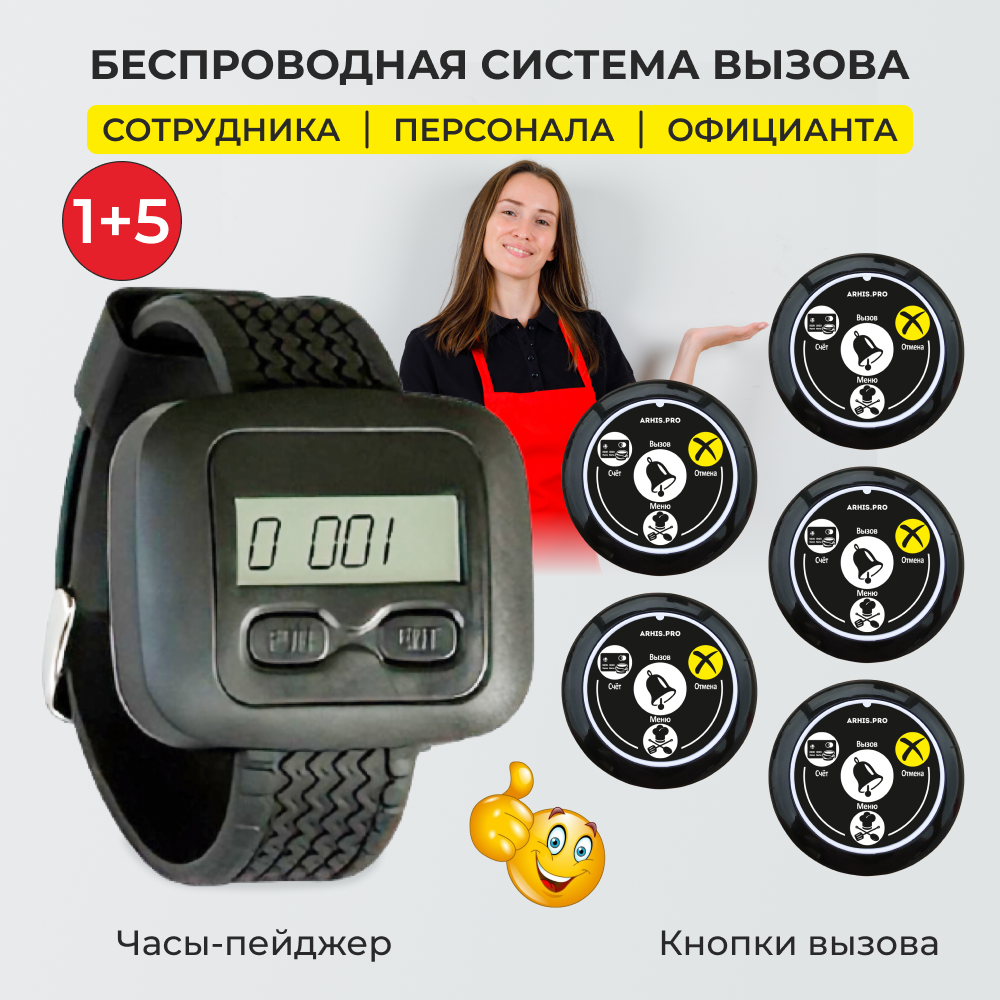 Кнопки вызова официанта и персонала с часами-пейджер. Комплект системы вызова персонала: кнопка вызова официанта Смайл "Меню, Счет, Вызов, Отмена" - 5 шт, пейджер "Эконом" - 1 шт. Дальность 300+ м.